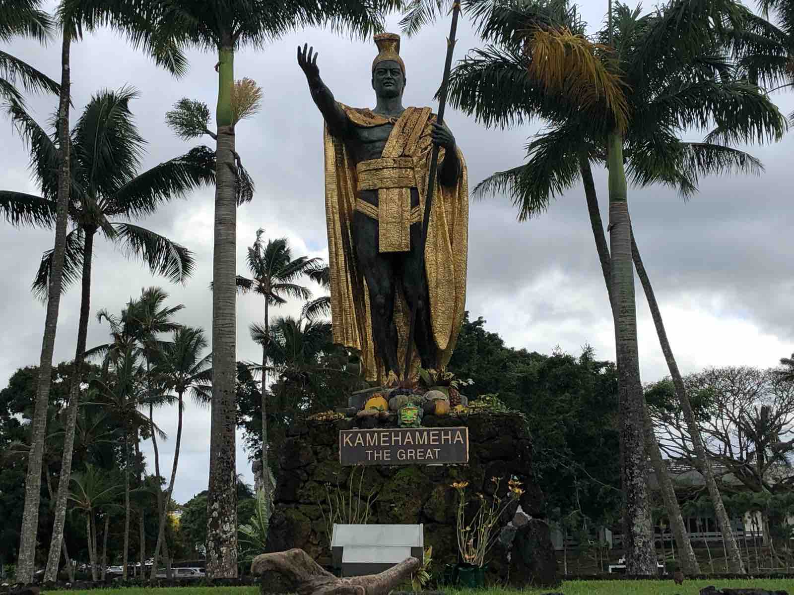 カメハメハ大王の像が建てられている場所は,ハワイ州内に3か所,アメリカ本土に1か所あります。そのなかでも最も有名なのは,オアフ島イオラニ宮殿向かいに建っている像です。おそらく日本人観光客の知っているカメハメハ像はこれであろうと思いますが,私は見たことがありません。また,ハワイ島北部のハヴィの町からポロル渓谷展望台への途中にあるにある小さな町カパアウにあるカメハメハ大王像が1番最初に作られた大王像です。ここには行きましたが,残念ながら像を見損ねました。そして,ヒロに大王の像が建てられたのが1997年で,これはハワイ州にある大王像の中では1番新しいものです。