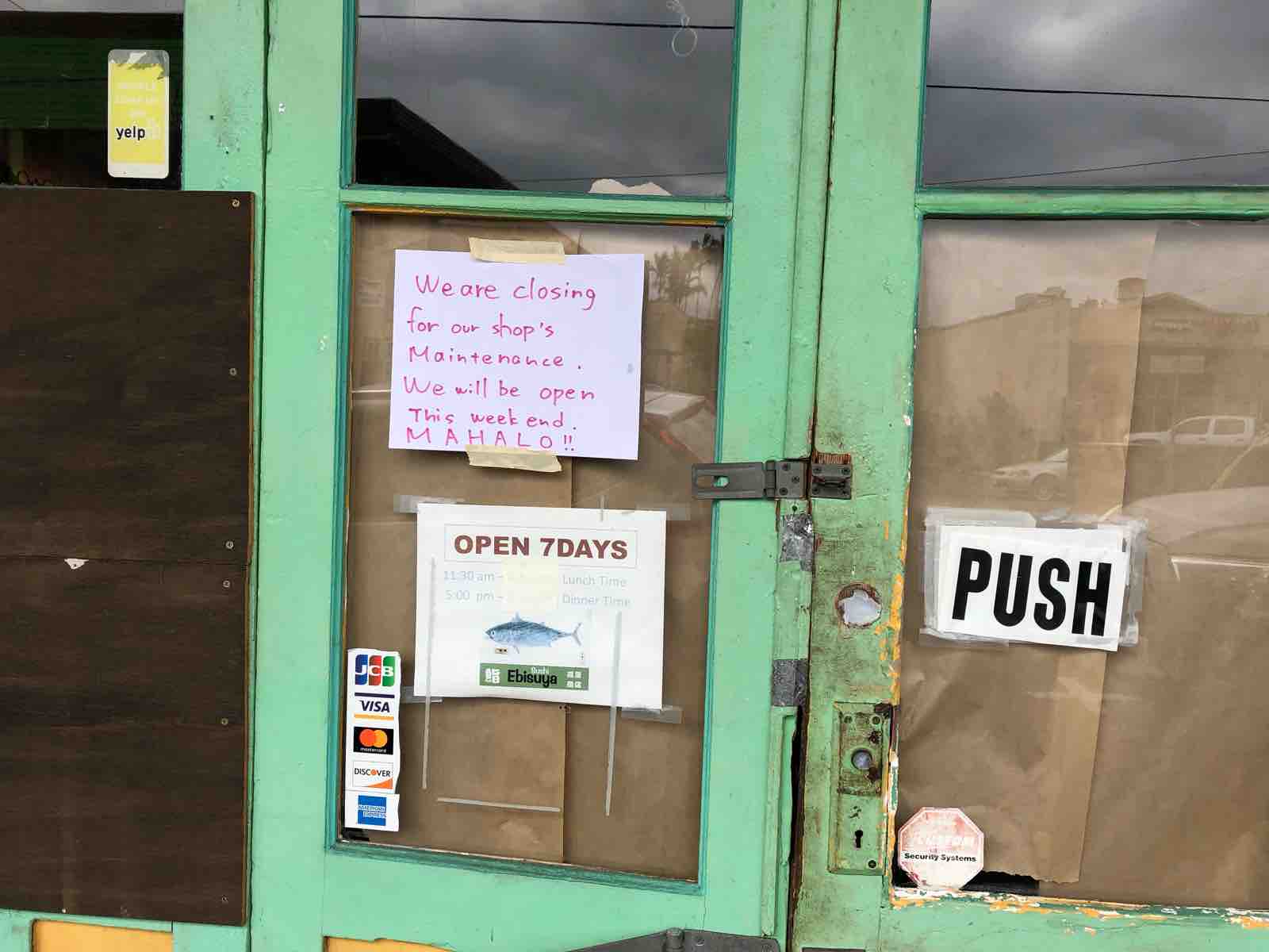 私が今回ハワイ島でしてみたかったちょっとしたことにひとつ目はEbisuyaというお寿司屋さんを再訪することでした。3年前に来たときはヒロの町には半日ほどしかいなかったのですが,そのときにお昼を食べたところ。そのとき,また来るねと言ったので行って見ようと思ったわけです。場所は定かでなかったのですが,さほど広くもないヒロの町,なんとか見つけました。