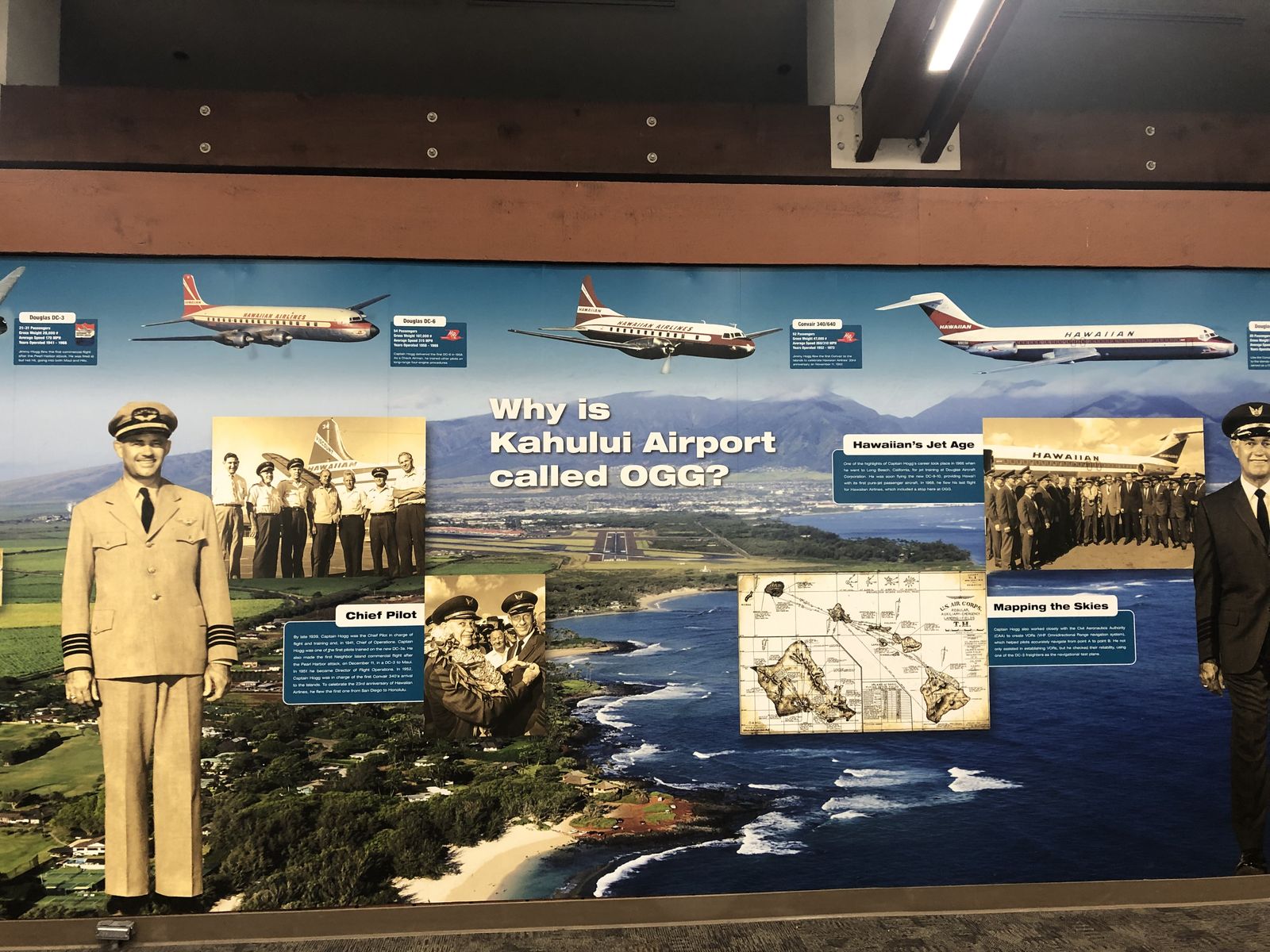 さて,「TSA-Pre」の私は,マウイ島の空港のセキュリティを簡単に通過して,あとは搭乗を待つだけになりました。マウイ島カフルイ空港の空港コードは,なぜか「OGG」なので,私はそれを不思議に思っていたのですが,空港のコンコースにその理由がかかれてありました。それは,1960年代後半に今のハワイアン航空が運航していた航空機を8席のS-38水陸両用機からDC₋3やDC₋9へ変更する仕事をしたBertram J. Hoggに敬意を表してつけられたものだということでした。