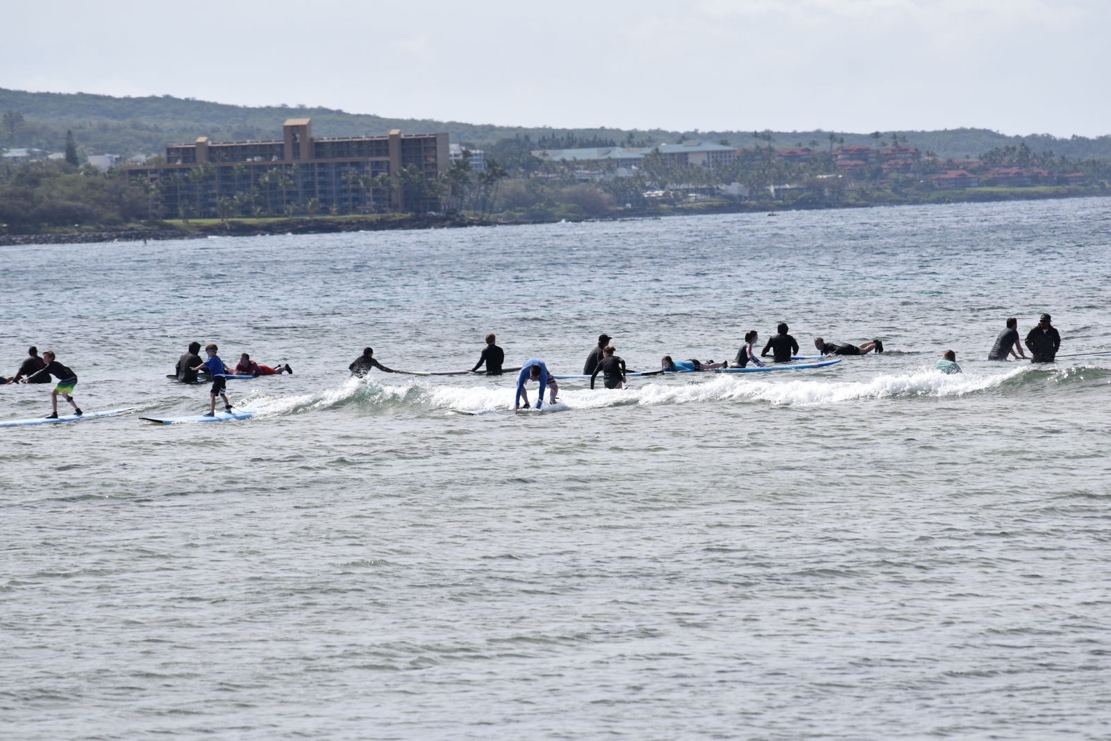 この日は遠くにサーフィンの練習をしている若者たちがいました。このビーチは波が高くないのでサーフィンに向いていないのですが,それが幸いで初心者には向いているのでしょう。いずれにしても,必死に泳いているような人は皆無で,ほとんどの人は何もせず,ビーチでイスに座って本を読んでいたり,ごろっとしているだけです。時折クジラが泳いでるのが見えたり,カメが泳いて出るのが見えたりするのが愛嬌です。こんなすばらしい海岸を知ってしまうと,ますます,ゴミだらけ人だらけで悪臭さえする日本の海岸が貧しく思えます。