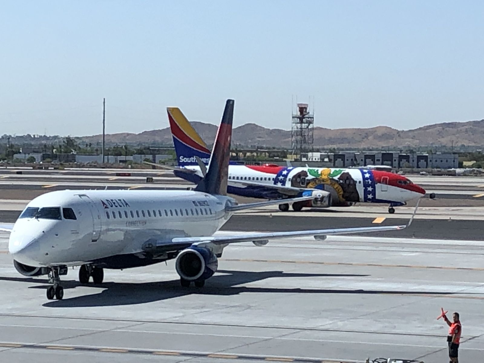 乗り換えたのは小さいボンバルディア社の旅客機で,かなり古そうな機体でした。ロサンゼルスからフェニックスまでは1時間30分ほどのフライトです。乗り換える乗客がまだ来ないということで出発が30分ほど遅れました。
