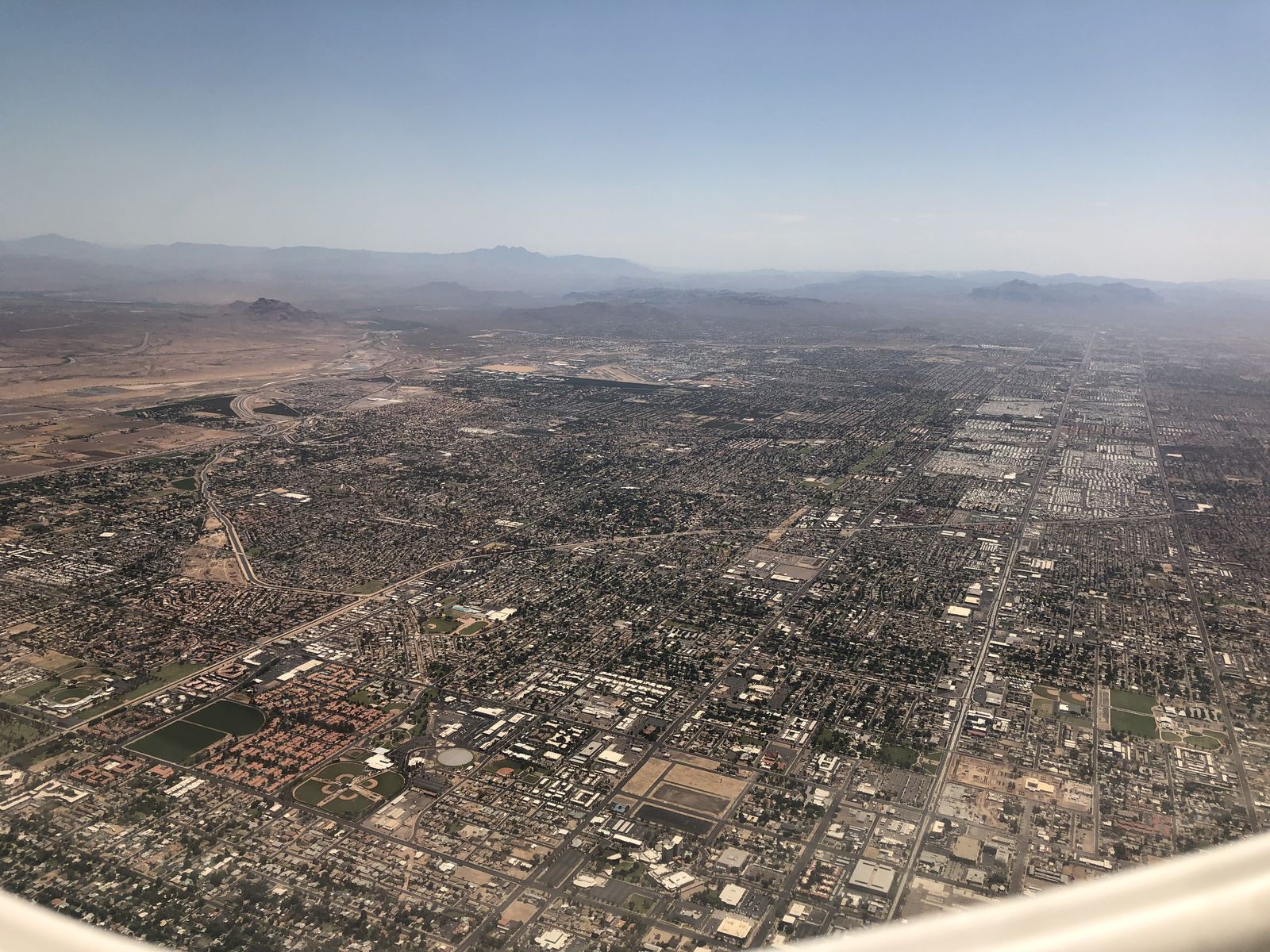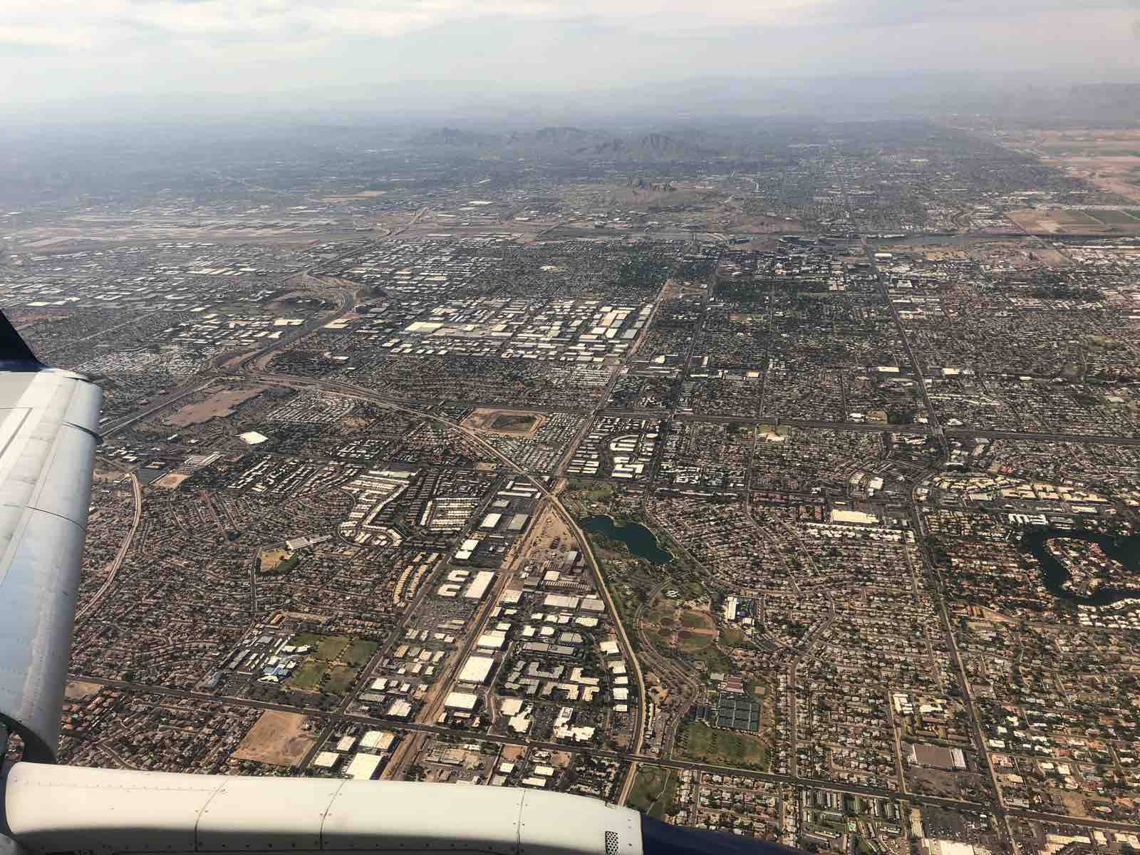 やがて搭乗し,定刻に離陸しました。窓際の座席を選んであったので,晴れ渡る窓からはフェニックスの町がよく見えました。19年前に来たときに比べて,フェニックスの町はずいぶんと発展を遂げていました。