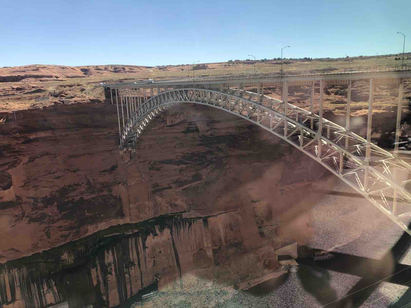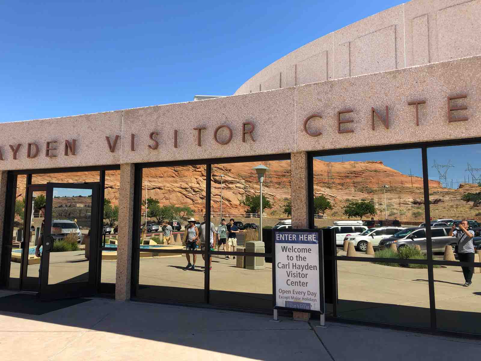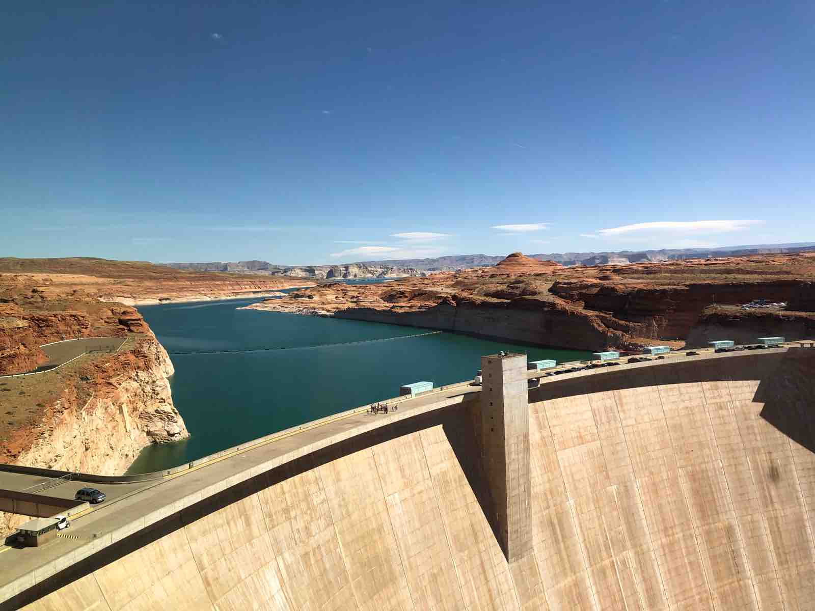 ホーシュシューベントを後にして,ページの街のマクドナルドで朝食を食べ,次にグレンキャニオンダムに行きました。ビジターセンターに入ると,巨大な窓からその絶景を眺めることができました。