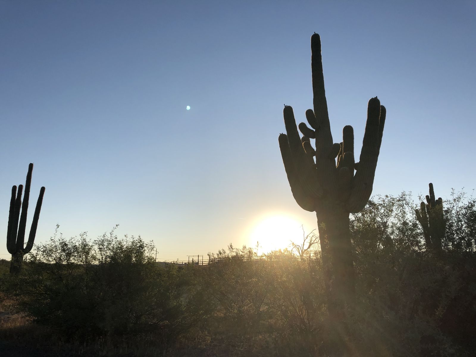 フェニックスの少し手前にブラックキャニオンシティという田舎町がありました。ちょうど夜明けだったので朝日を見ようと,ここで一旦インターステイツを降りました。こののどかな町でサボテンと朝日を眺めることができました。