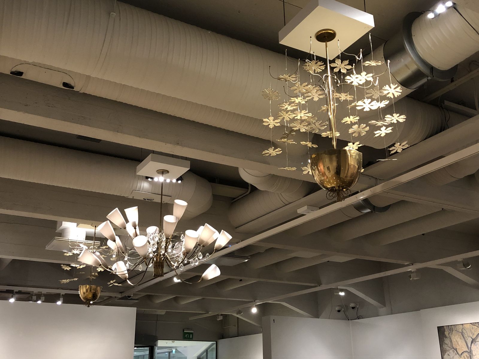 病院の壁にかかれたという絵は,ムーミンの挿絵を思い起こしました。また,「都会のパーティ」「田舎のパーティ」というふたつの大きな壁画はもともとは市役所のホールに描かれ,それが現在この美術館にあるものですが,この絵には,ムーミンが密かに描かれています。そのときのホールの照明もそのままここに移されました。