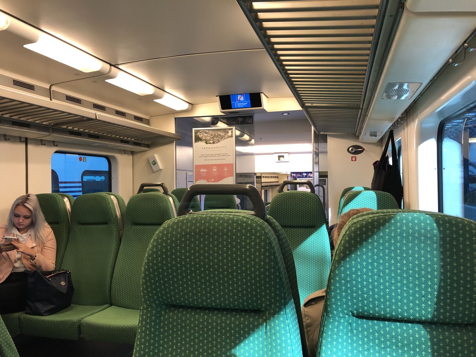 電車は日本のものとそう変わったこともなく,違いといえば日本と違って人が少なく席が空いているということでした。席は指定で,座って外を眺めていると,ヘルシンキ郊外の景色が旅情を誘いました。朝あれほど降っていた雨も止んで,ずぶぬれで不快だった足元も次第に乾いてきました。