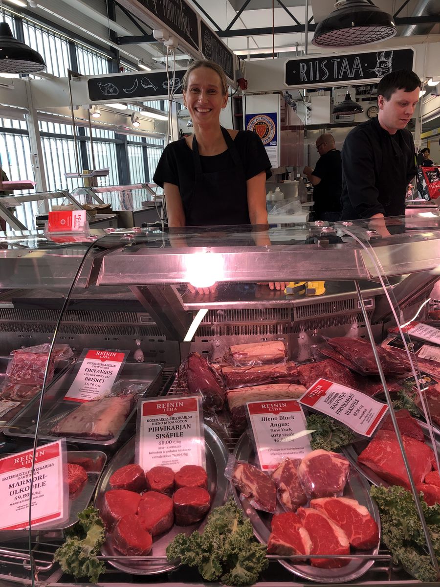 まず行ったのがハカニエミ・マーケットホールでしたが,ここは現在改装中だったのが残念でした。とはいえ,改装中の建物の前の広場に臨時のプレハブ小屋が作られていて,そこで営業をしていました。このなかに,老舗の肉屋さん「レイニン・ニーハ」がありました。感じのよい女性の店員さんがいて,目が合ったので,日本で映画に出てきたお店ですよね,と話しかけたら笑っていました。