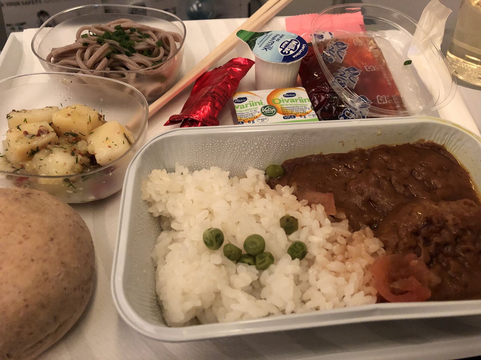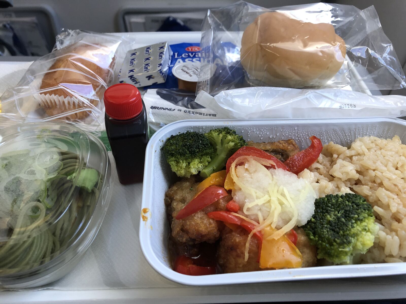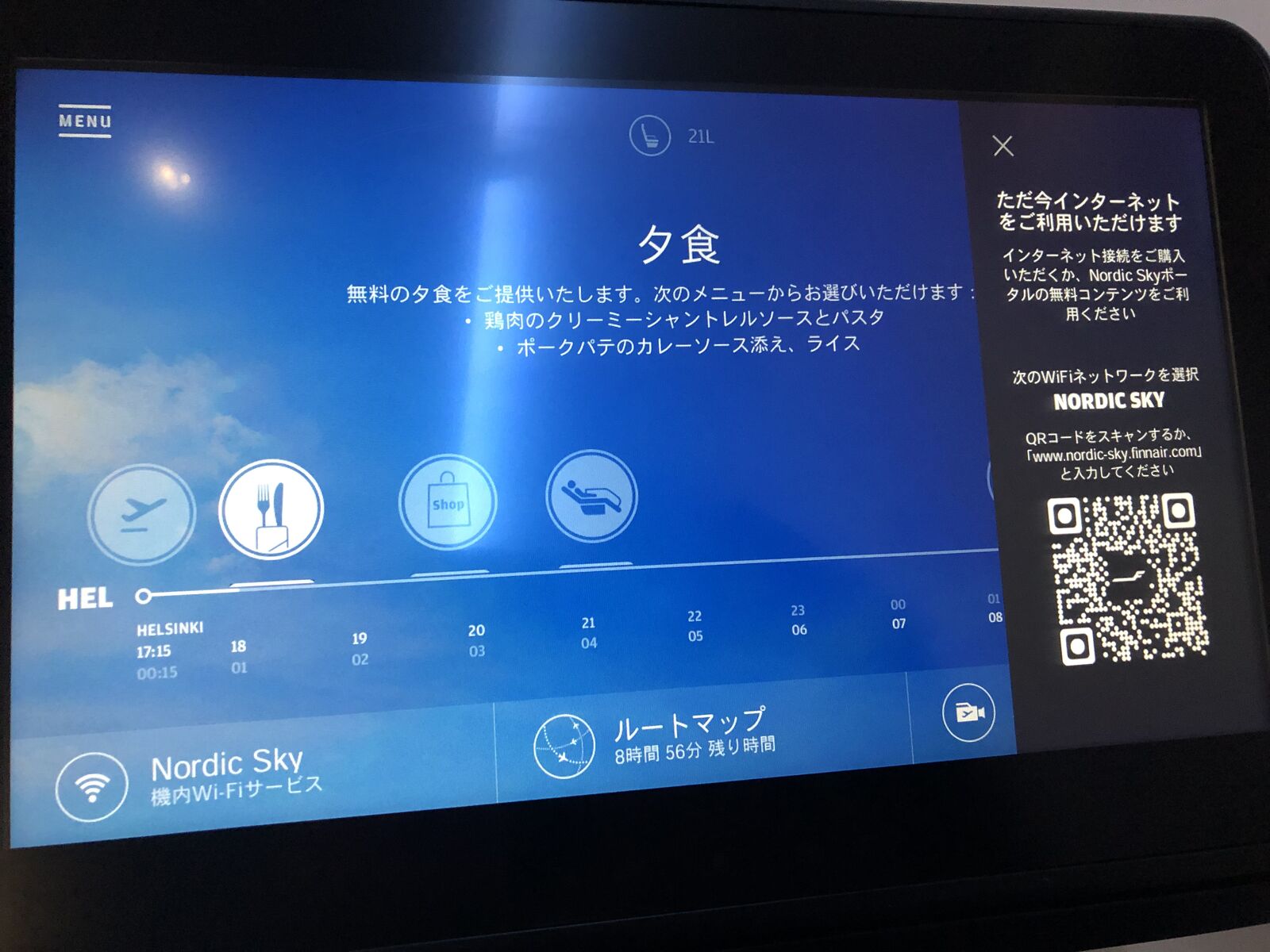 帰りもまた,エコノミーコンフォートの最前列の窓際をとってあったのですが,行きと同じエアバスA350なのに行きとは別の機体のようで,エコノミーコンフォートの最前列が3席ありました。フィンエアーのA350ではエコノミーコンフォートの最前例だけは通常2席なのです。室内のディスプレイに機体の外についているカメラから機体の外観が映し出されていたのでそれを見たら,この飛行機は幸運にも「マリメッコジェット」でした。2席であればとなりが空いていることも多いのですが,今回は3席ということで,ひとつとなりは空席でしたが通路側の席にはトヨタ自動車に勤めているというドイツ人の男性が座りました。
