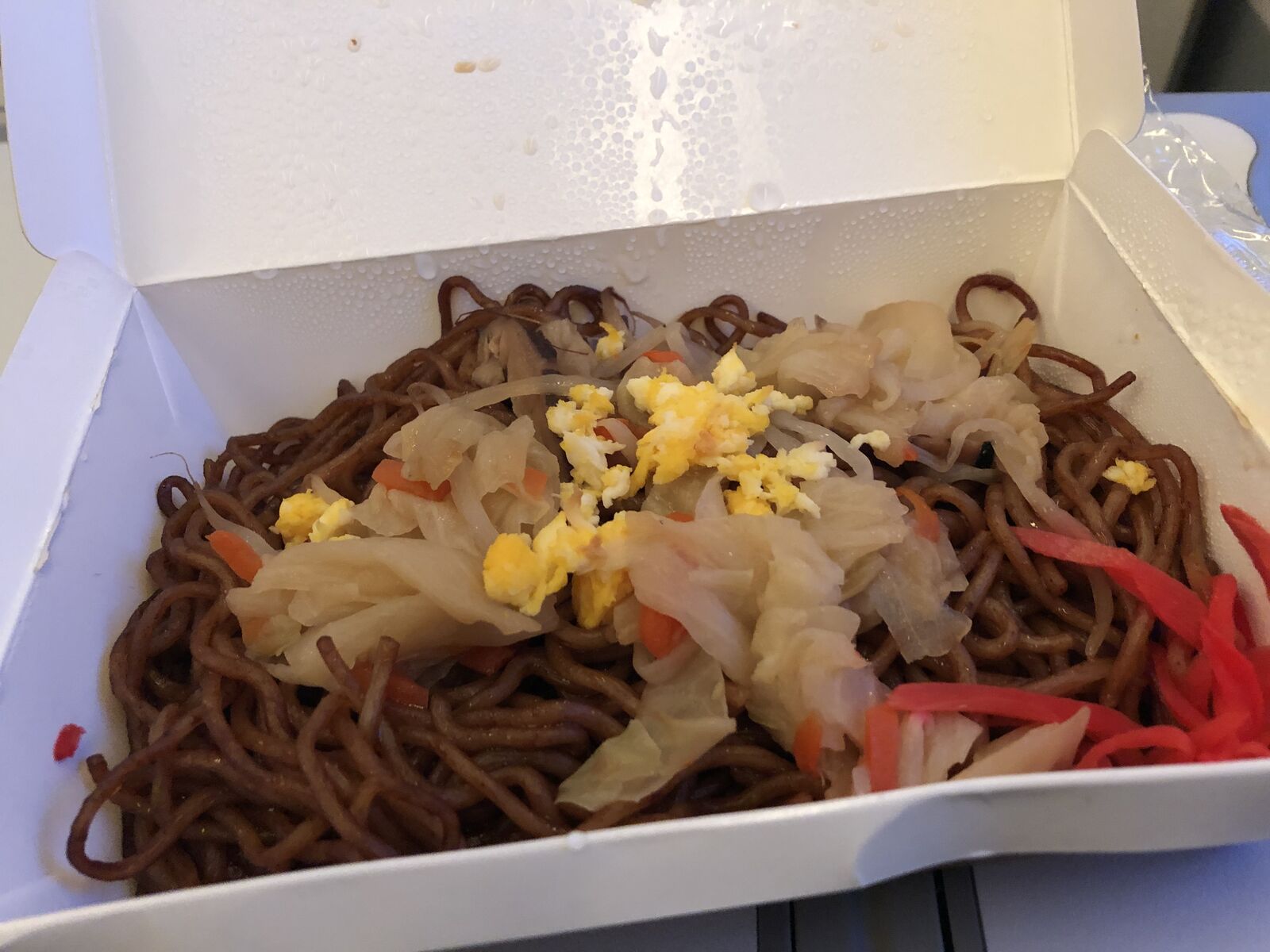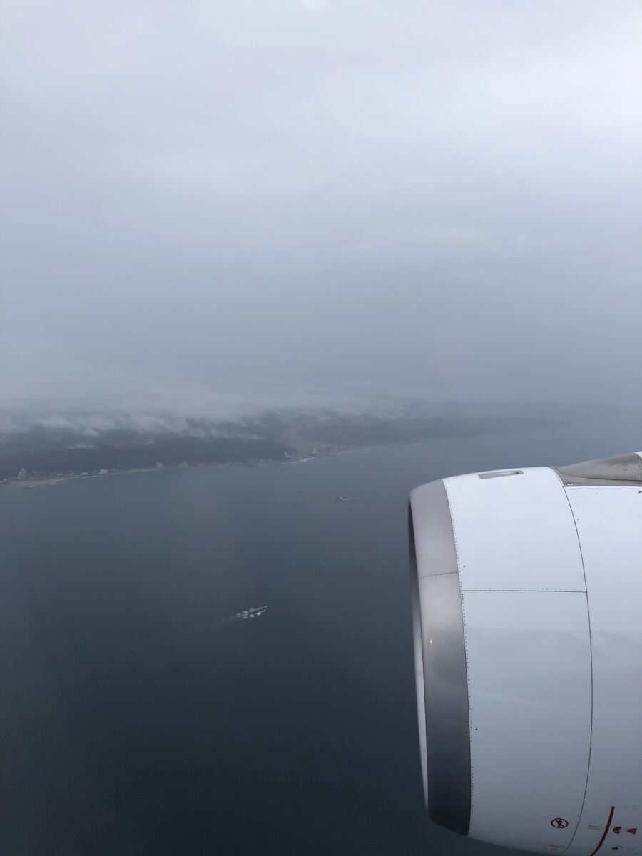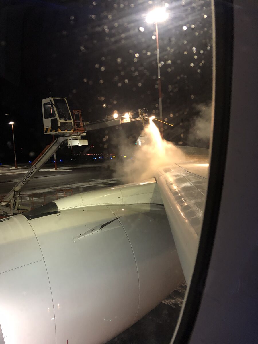 離陸前に,機体の主翼に付いた氷を溶かすために防徐雪氷液(ADF=Anti-/De-icing Fluid)が噴射されました。窓からそれを見ていてその迫力に圧倒されました。