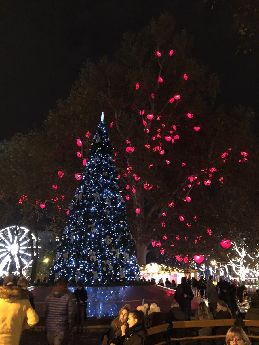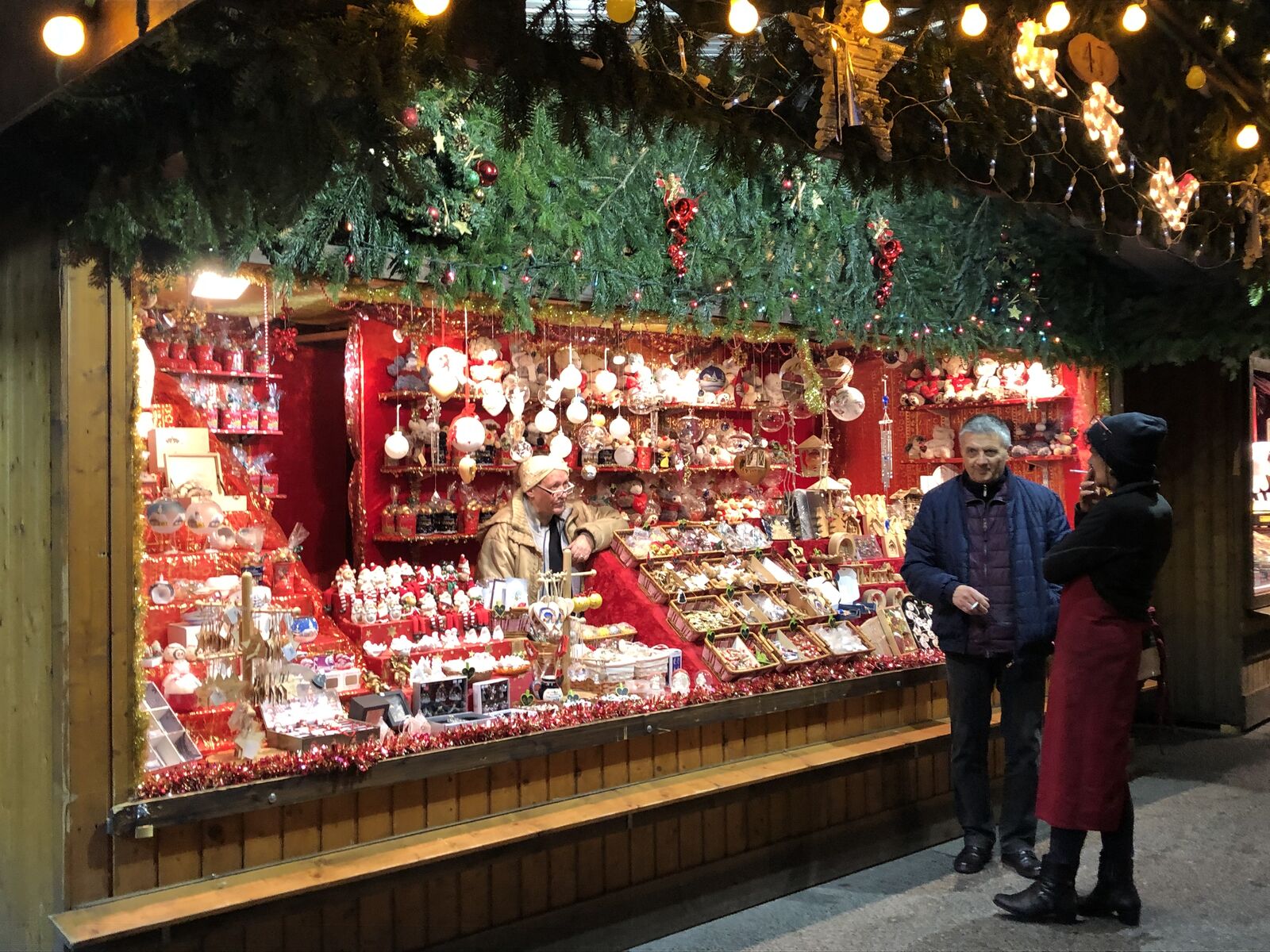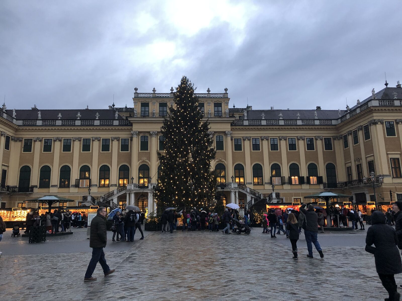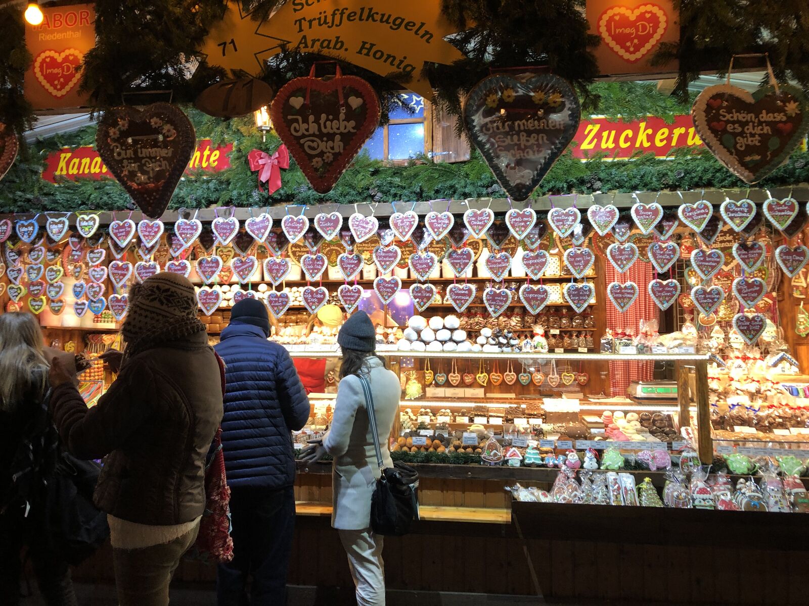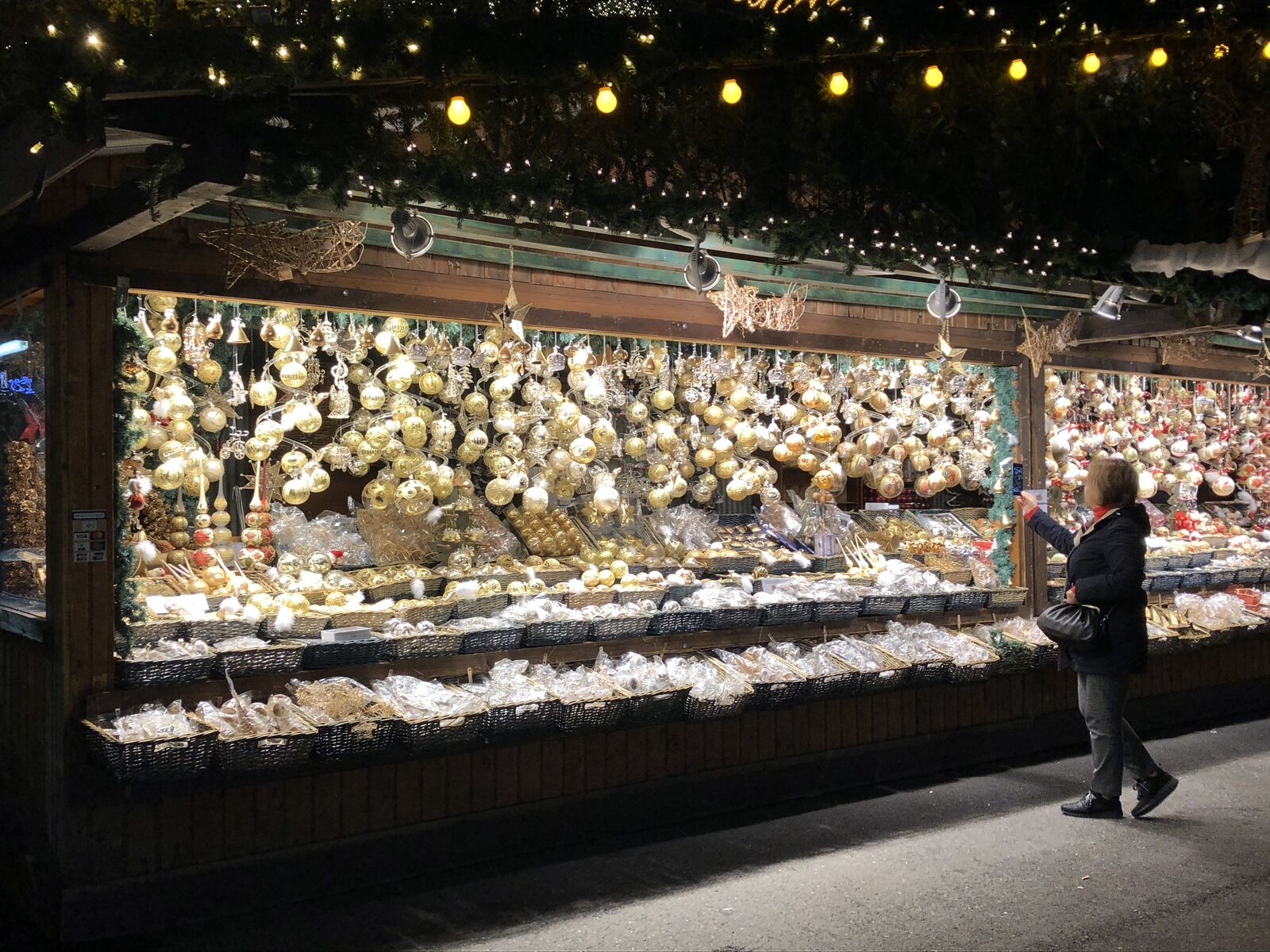 広場の中心にクリスマスタワー(クリスマスピラミッド)とよばれる大きな仮設の塔が置かれ,ここでホットワインやホットチョコレートが売られていて,その周囲に出店が並び,簡単な食事や土産物が売られています。出店は日本のようなテントではなく,木造の家屋のような作りになっていて,華やかなライトアップで飾られます。
