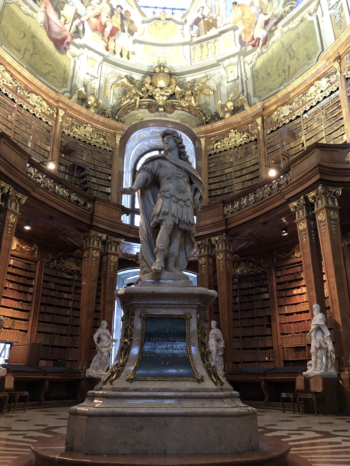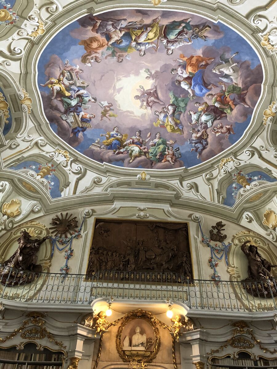 それは,世界で最も美しい図書館といわれるアドモント修道院図書館(The library of Admont Abbey)でした。思わず息を飲み込むほど美しい白亜の図書館は,アルプスのふもとに立つ修道院図書館としては世界最大のライブラリーで,約20万冊を収める70メートルにも及ぶ内部ホールは建築家ヨーゼフ・フーバーがバロック後期様式で1776年にデザインしたものです。天井には学問や宗教,芸術についてのフレスコ画が描かれていました。2008年に改修が終了したばかりで,創設時代の美しさがよみがえったそうです。ちょうどウィーンで見た国立図書館を新しくしたような感じでした。