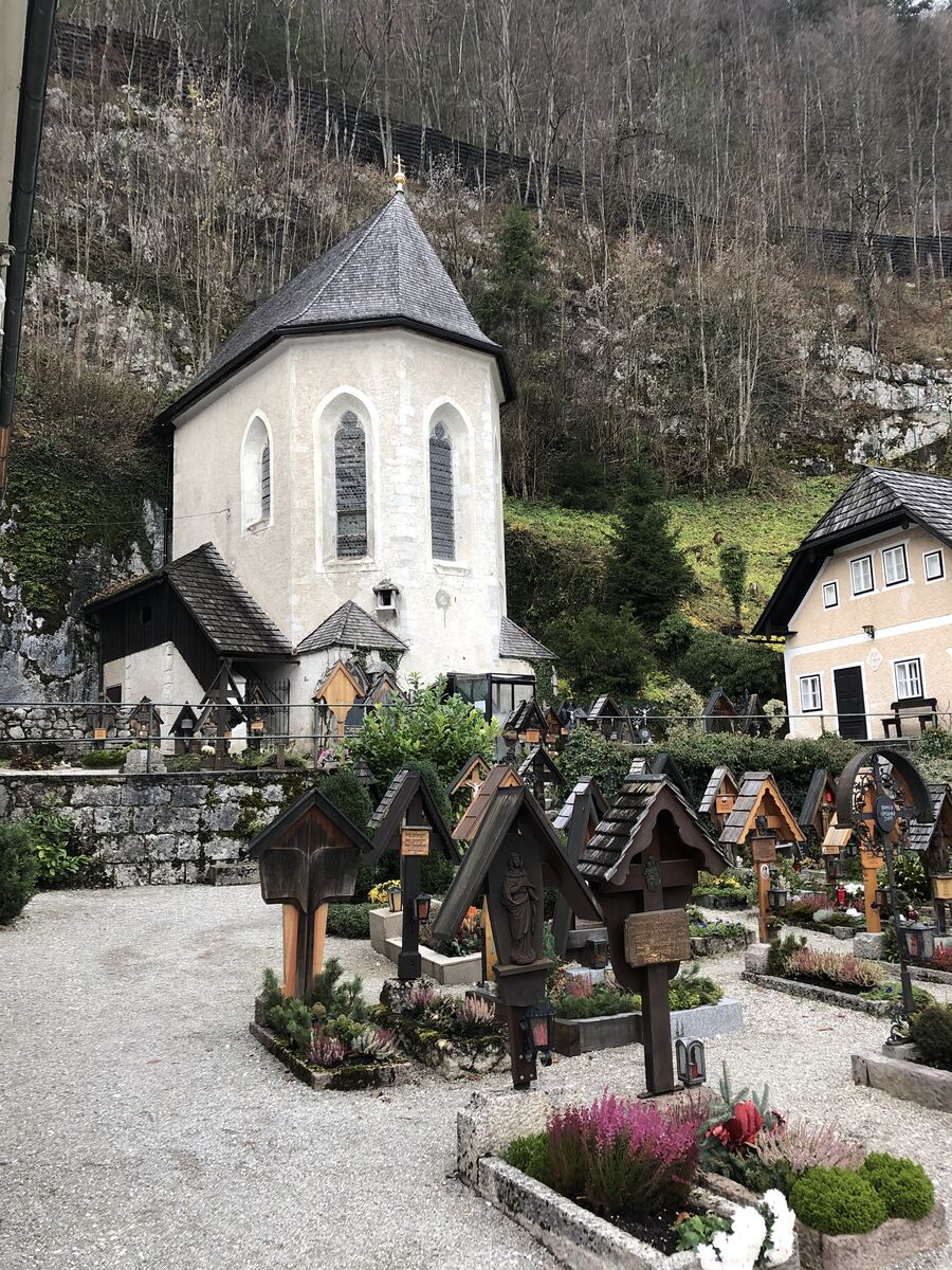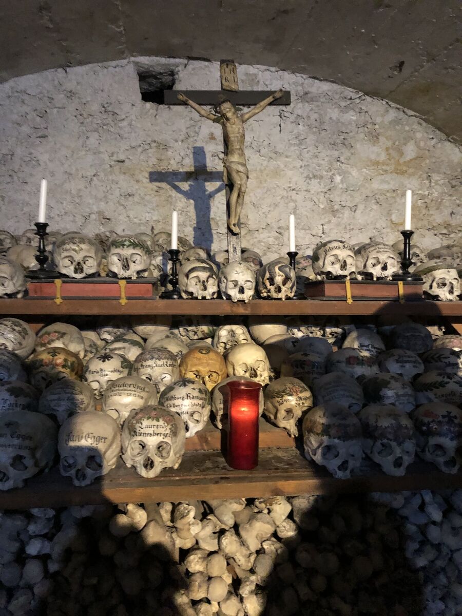 帰る途中,高台にカトリック教会がありました。土地の狭いハルシュタットでは墓地の場所が十分にとれないので,埋葬後10年ほどすると遺骨を取り出して次の遺体を埋めるという風習があったそうです。取り出した遺骨はバインハウスという教会の裏手にある納骨堂に収めらていて,それを見ることができるということだったので見てきました。