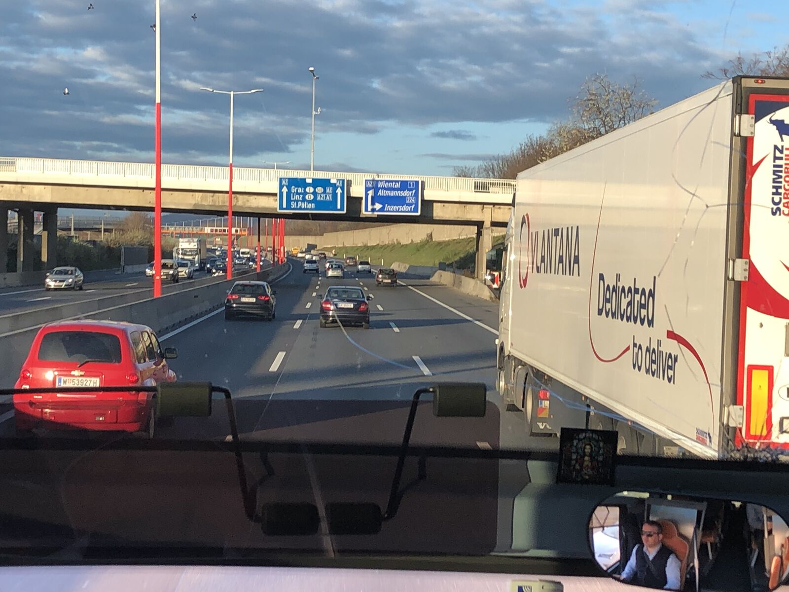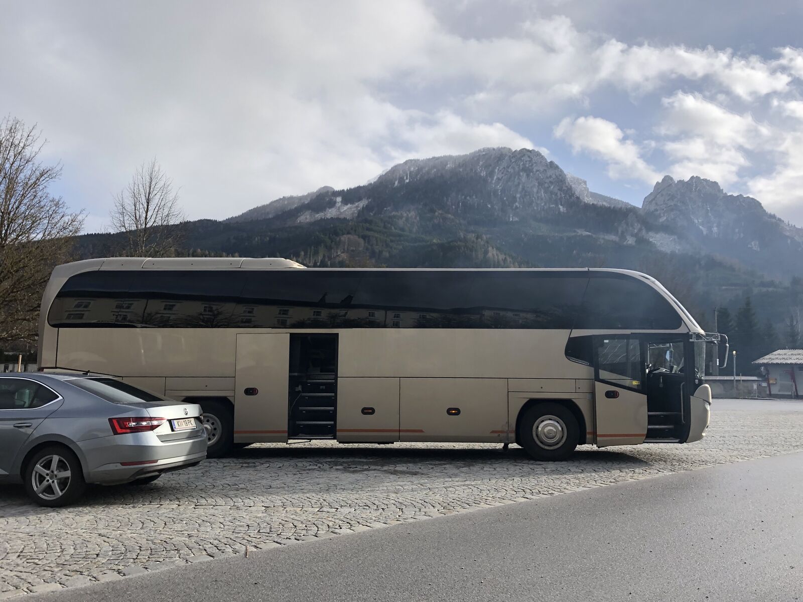 集合時間は午前7時50分,集合場所はウィーン国立歌劇場裏の観光案内所で,私が到着したときにはまだほかに参加者はおらず,どのくらいの参加者がいるのかなと思ったのですが,大型の観光バスがやってきたので,結構多くの参加者がいるんだなと思いました。私は早めに集合場所に着いたおかげでバスの最前列に座ることができたので,ずっとバスの中から景色を見ることができました。