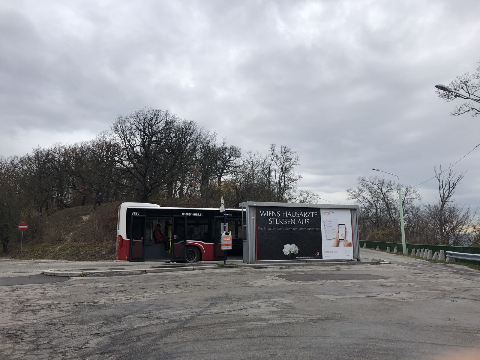乗ってからわかったのですが,Wagenwiese は一番手前で,その次のバスの終点 Cobenzl Parkplatz はカーレンベルグのひとつ手前の展望台のある場所,そして,レオポルツベルグはカーレンベルグのさらに先でした。カーレンベルグの先のレオポルツベルグにも展望台があって,そこからカーレンベルグまで戻るのが絶好のハイキングコースということでした。であるなら,レオポルツベルグまで行ってみたいものだと思いました。ともあれ,私の乗ったバスの終点であった Wagenwiese はカーレンベルグよりはるかはるか手前だったし,そこからカーレンベルグまでは急坂でもあり,歩いて行ける距離でもありませんでした。そこで,Wagenwiese でバスを降ろされても次に来るバスを待つしか方法はありませんでした。ハイリゲンシュタットで慌ててバスに乗る必要もなかったのです。