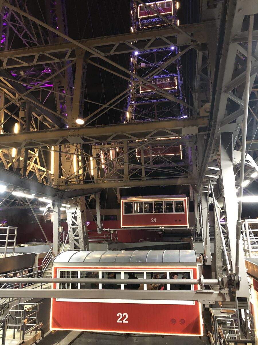 私は,5月にオーストラリアのブリスベンで,そして,8月にはフィンランドのヘルシンキで観覧車に乗りました。どうやらこのところ観覧車づいています。しかし,海外では,観覧車は日本の観覧車のように停まらずにゆっくり回転するのではなく,降り口で一旦停車をします。停車をして順々にゴンドラに客を乗せていって,すべてのゴンドラに乗客が乗り終わったら今度は止まらず何周も回転するのです。この観覧車の場合は,レストランになっているゴンドラは地上に着くたびにボーイが中に入って片付けをし,新しい料理を運び込んでいました。なんと水も継ぎ足していました。私は一般のゴンドラに乗りましたが,この観覧車の最上階からは思ったよりずっと眺めがよくて,ウィーンの夜景を十分に楽しむことができました。