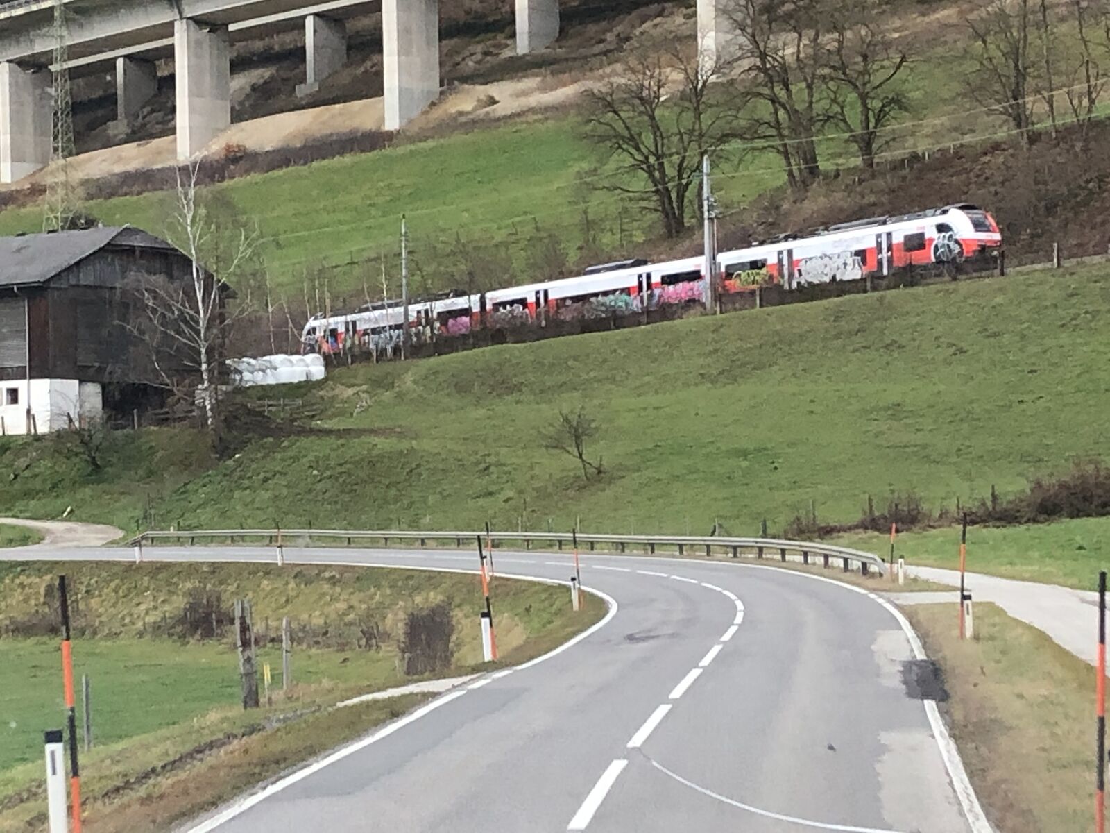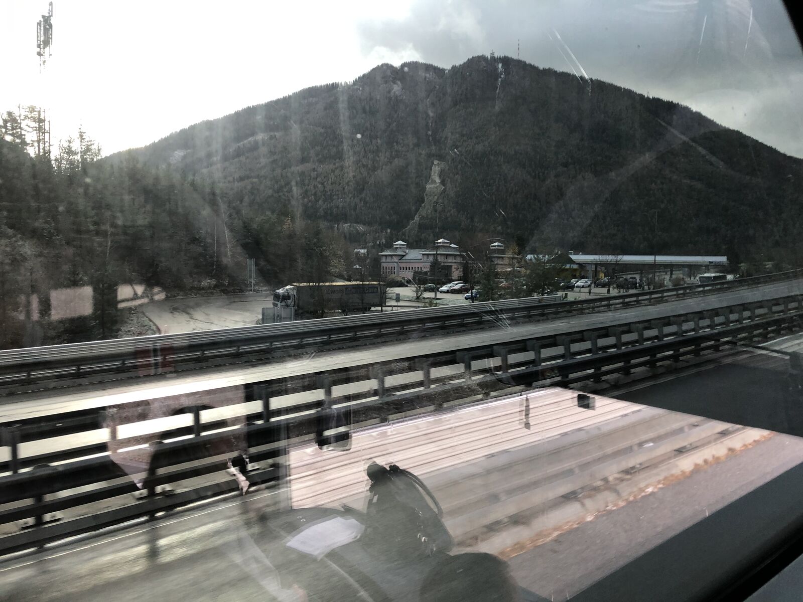 車窓からみるオーストリアの風景はなかなか興味深いものでした。きれいな国です。山岳地帯になると雪が降っていましたが,それもやんで,あたりは次第にアルプスの風景になってきました。