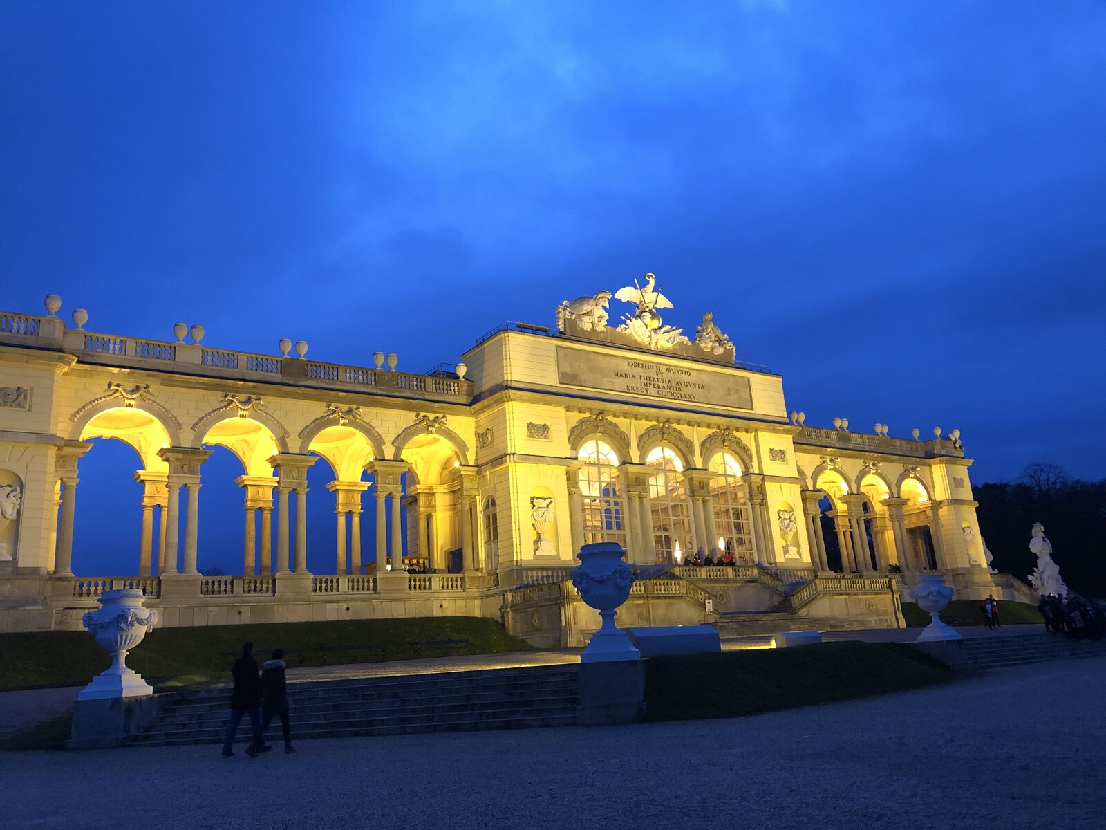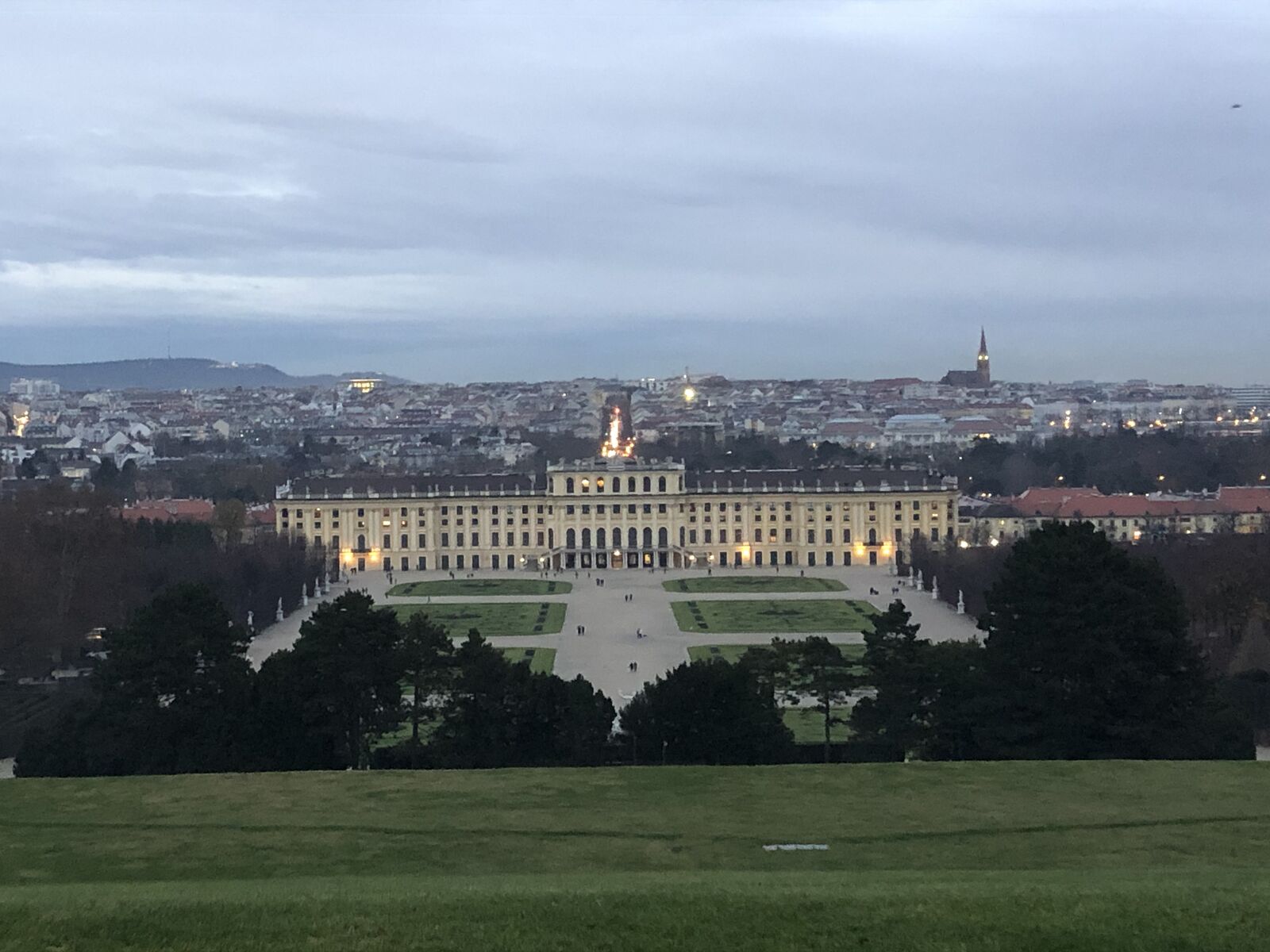着いた頃にはすでに日が沈んでいましたが,このころからシェーンブルン宮殿に行く人でいっぱいでした。この宮殿はこの時間に入るほうが空いているようです。私は,宮殿内部は昨年見たので,行先はグロリエッテの丘でした。この丘,30分ほど坂を登る必要があるのです。坂の途中で登りたくなくなった幼児が座り込んでダダをこねていました。しかし,登りきったところからのウィーンの景色は最高でした。
