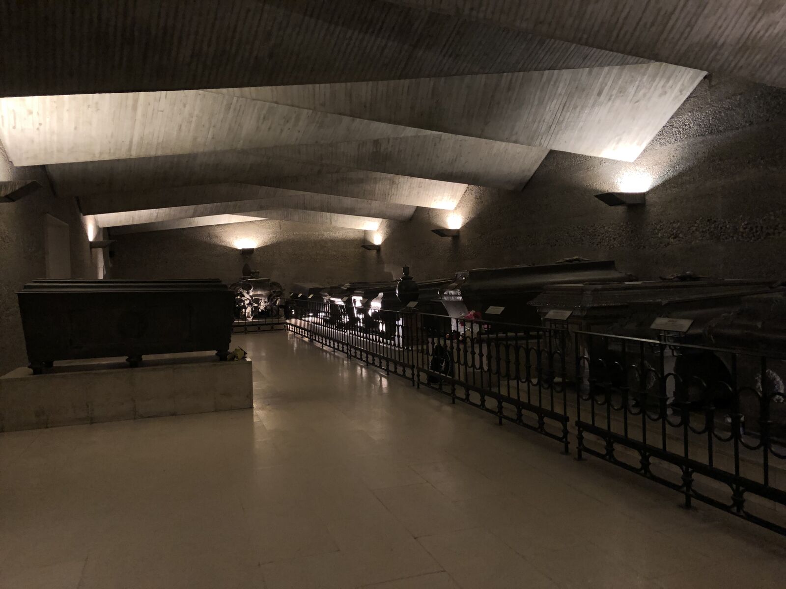 間違えて教会の入口を入ると,ちょうどミサの最中でした。その荘厳な雰囲気は私のようなキリスト教の信者でないものが入ることを許されない雰囲気がしました。皇帝納骨堂への入口はその右手の建物でした。入場料を払って地下に降りて,私は驚きました。地下の巨大な空間には,延々と柩が横たわっていました。そのなかのひときわ巨大で豪華な柩はマリア・テレジアとその夫フランツ・シュテファンのものです。そして,さらに進んだ部屋に3体並んでいたのがフランツ・ヨーゼフ,エリーザベト,ルドルフの柩でした。さらに,出口近くには近ごろ収められた柩がありました。