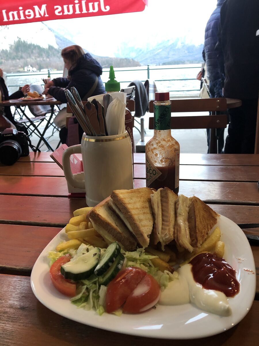 船着場に戻る途中で軽い夕食をとりました。バスの集合時間は午後4時10分。ウィーンに帰るのは午後9時ということだったので,腹ごしらえです。しかし,帰る途中でドライブインで30分ほどの休憩があって,その時間に夕食がとれるのでした。