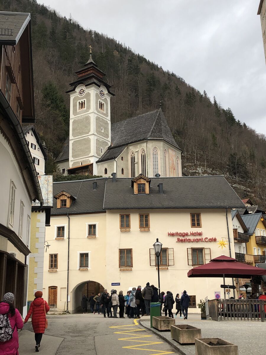 ハルシュタットでの滞在時間は2時間ということでした。すべて自由行動だったのですが,バスのガイドさんがバスを降りるまえに3,4つの観光モデルコースを説明してくれました。そのなかにはハルシュタット塩孔へ行くケーブルカーもありましたが,途中の展望台までで,塩孔までは時間がないから行かないで,と言われました。私は自由行動といわれても困ってしまいます。ケーブルカーに乗ろうとも思いましたが,往復するだけで時間がすぎてしまいそうだったので断念しました。狭い街でもあり,きままに歩こうかな,と思っていると,なんとなく,同じツアーにいた中国人の女性ふたりと歩くことになったのでした。