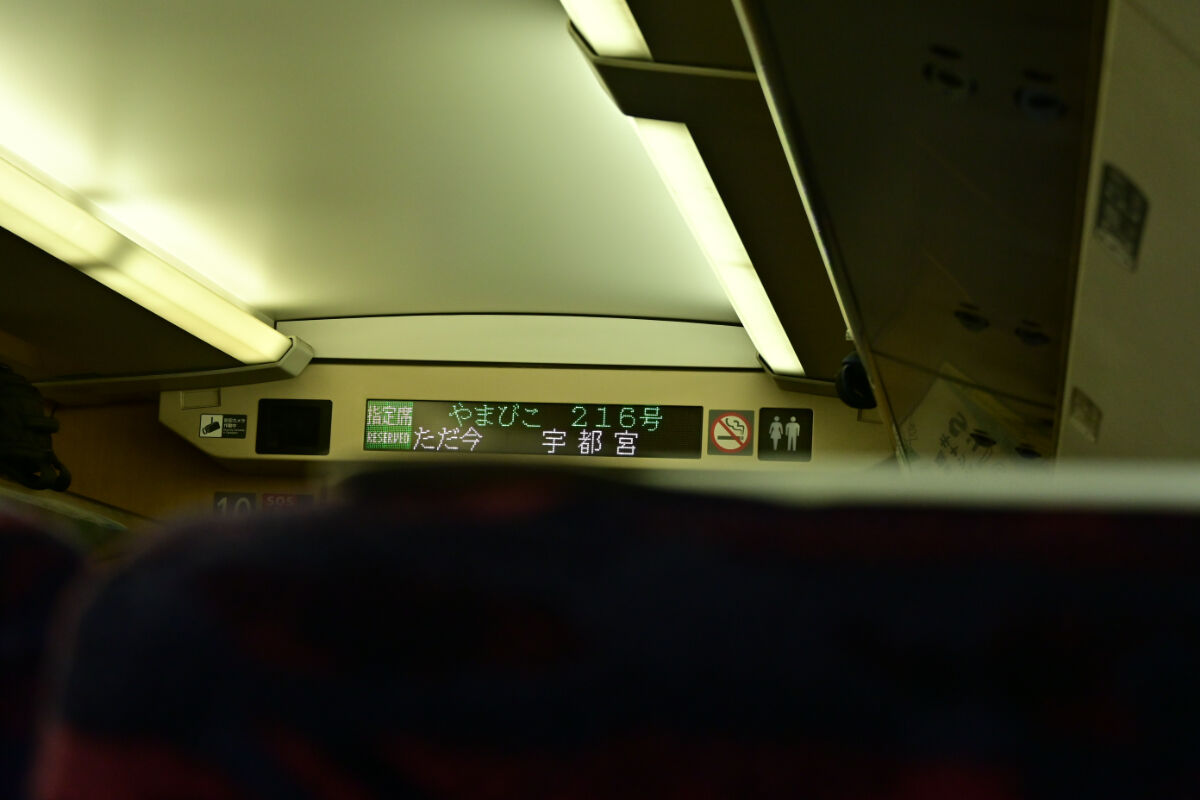 やってきた「やまびこ」216号は,行きに乗ったE5系とは違い,E2系という古いものでした。現在の新幹線車両は飛行機のように窓が小さいのですが,E2系のみ,大きな窓になっているのが特徴です。