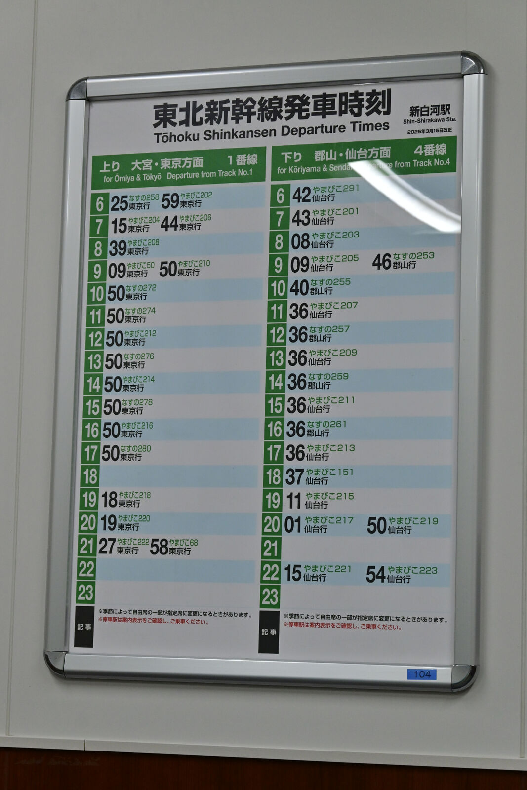 午後5時にレンタカーを返却,新白河駅午後5時50分発の「なすの」280号に乗って,東京駅午後7時16分着,午後7時30分発の「ひかり」661号に乗り換えて,名古屋駅9時14分着で帰宅する予定でしたが,午後4時ごろに新白河駅に着いたので,レンタカーを返却して,新白河駅午後4時50分発の「やまびこ」216号で,東京駅午後6時16分着,午後6時33発の「ひかり」657号に乗り換えて,名古屋駅午後8時19分着に変更しました。