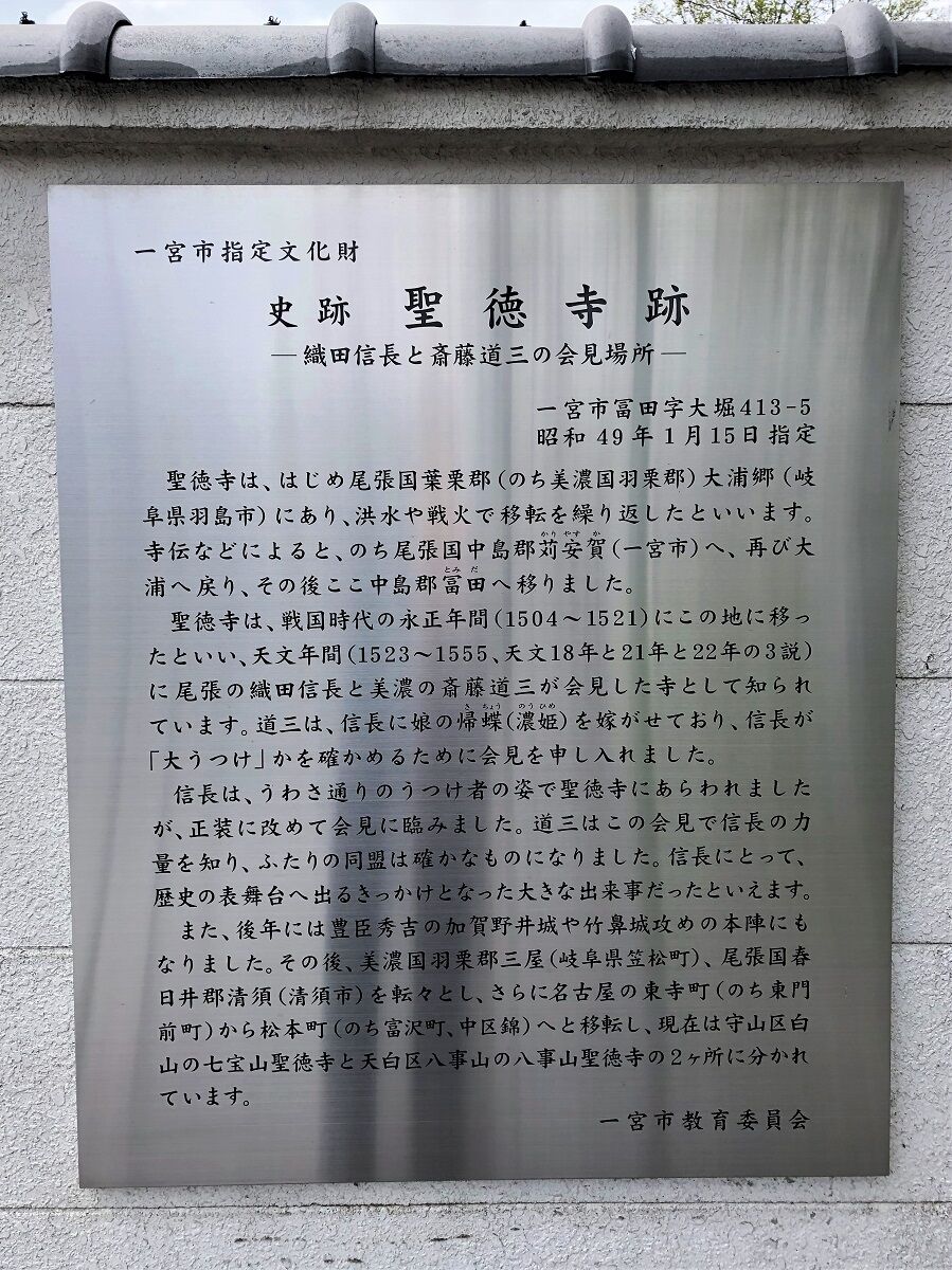 この会見の舞台となった聖徳寺があった跡地は一宮市の富田で,家から近いので,さっそく散歩してきました。これまで私は,富田という地名から,聖徳寺は名古屋市中川区の富田にあったとばかり思っていました。