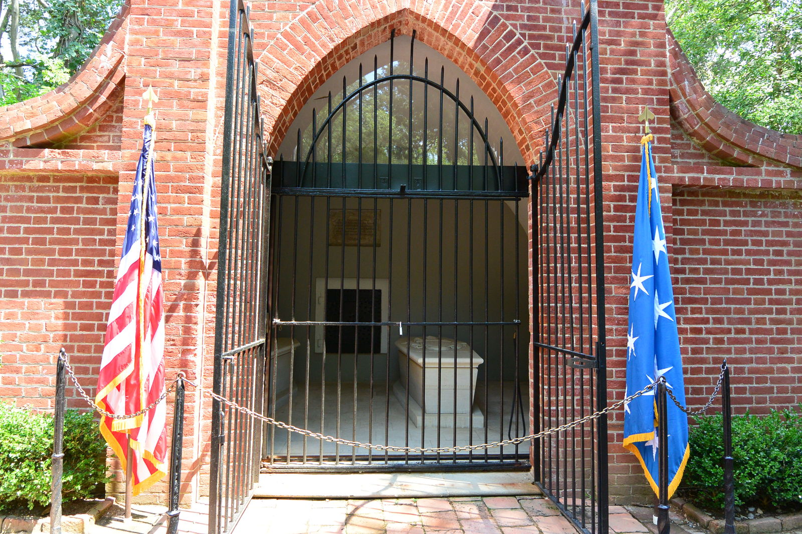 もともとワシントンは現在の地に葬られたわけではないが,現在は改葬されて,バウントバーノンの一角に建てられたこの写真の建物のなかの棺に眠っている。