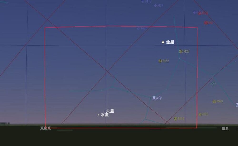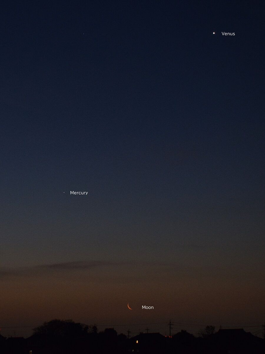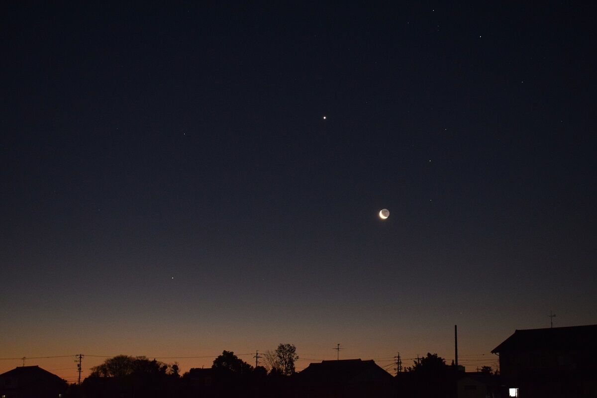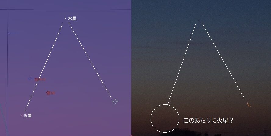 しかし,夕方の西の空低い位置にいるので,よほど空の開けた,しかも暗い場所があるところでないと,捉えることが困難です。また,明け方の北東でも見られるのですが,こちらもまた高度が低く,さらにむずかしいでしょう。