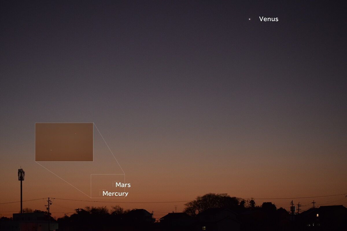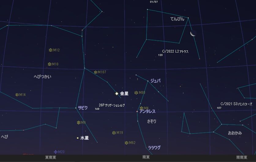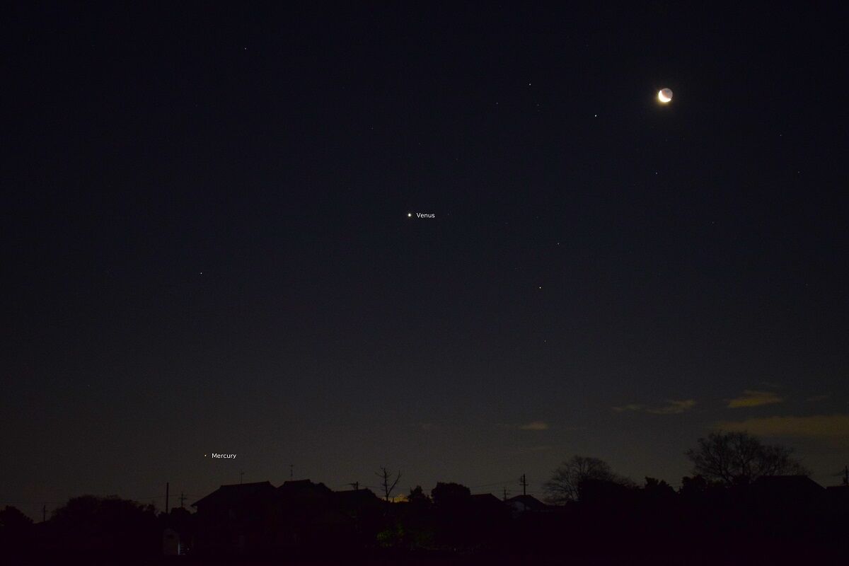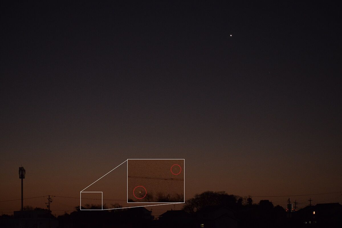 しかし,夕方の西の空低い位置にいるので,よほど空の開けた,しかも暗い場所があるところでないと,捉えることが困難です。また,明け方の北東でも見られるのですが,こちらもまた高度が低く,さらにむずかしいでしょう。