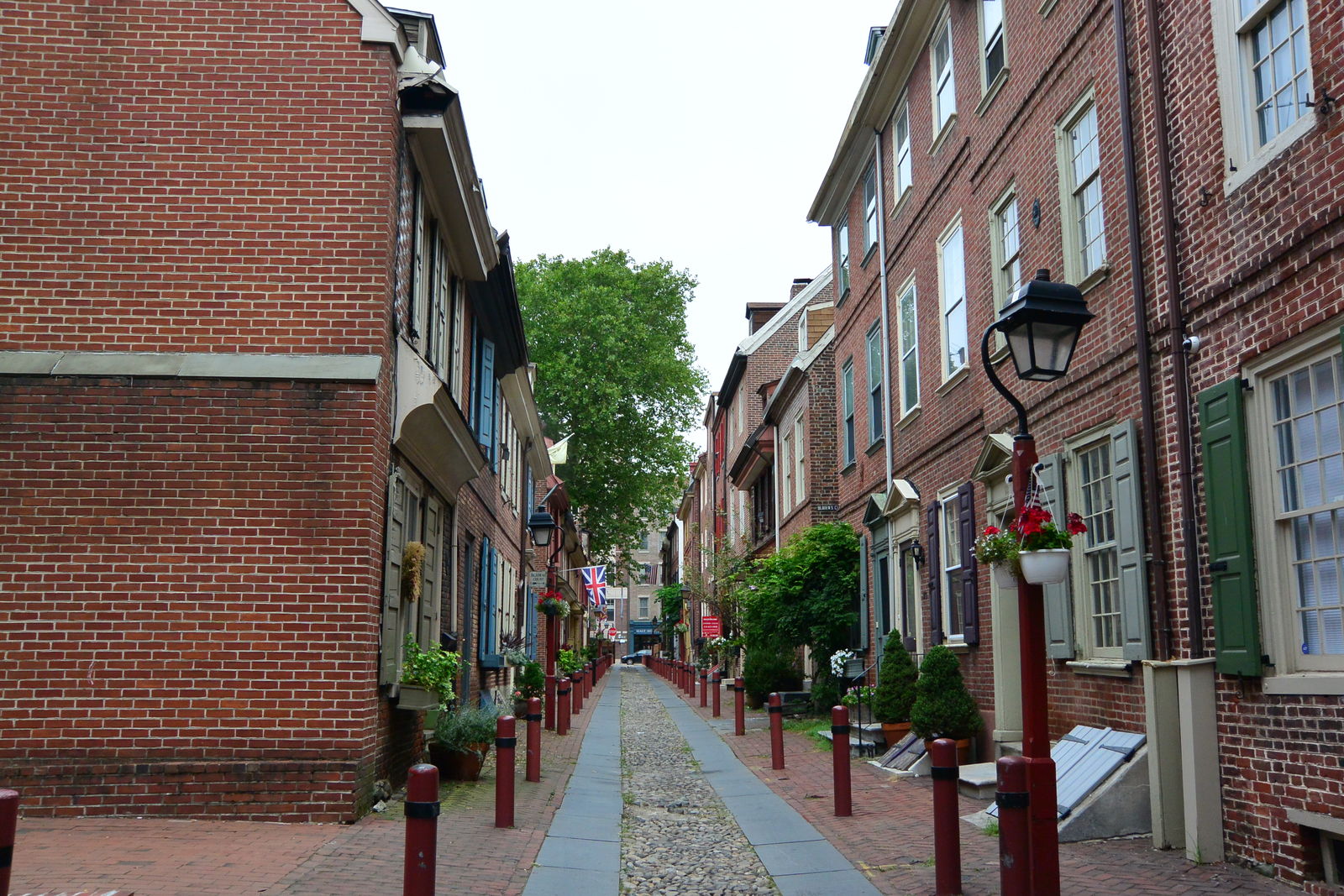 この一角はデラウエア川(Delaware River)が真近に迫っている狭い場所だが,そのなかでももっと東側,つまり,川に近い場所がエルフレス小径(Elfeth's Alley)である。石畳のエルフレス小径は1720年から1830年に造られたとされる現存するアメリカ最古の住宅街である。