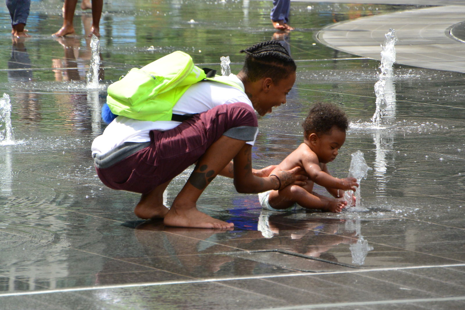 それはそれとして,この日もまた,ものすごく暑い日であった。市庁舎前の広場は地面から水が出ていて,ミニプールのようになっていた。そこで,子供を遊ばせている母親がずいぶんといた。