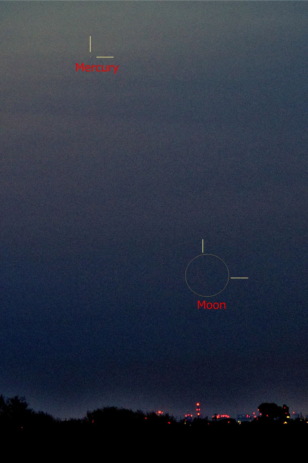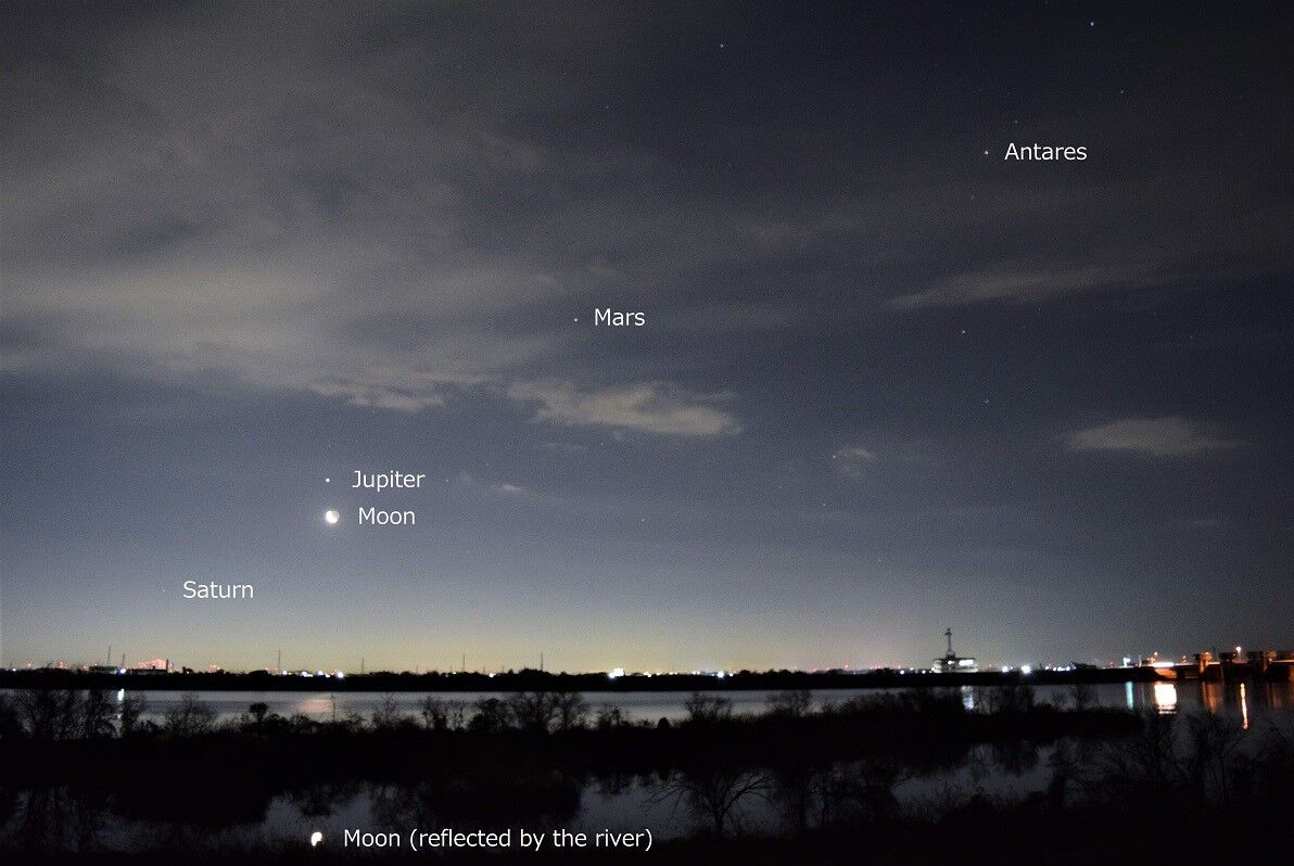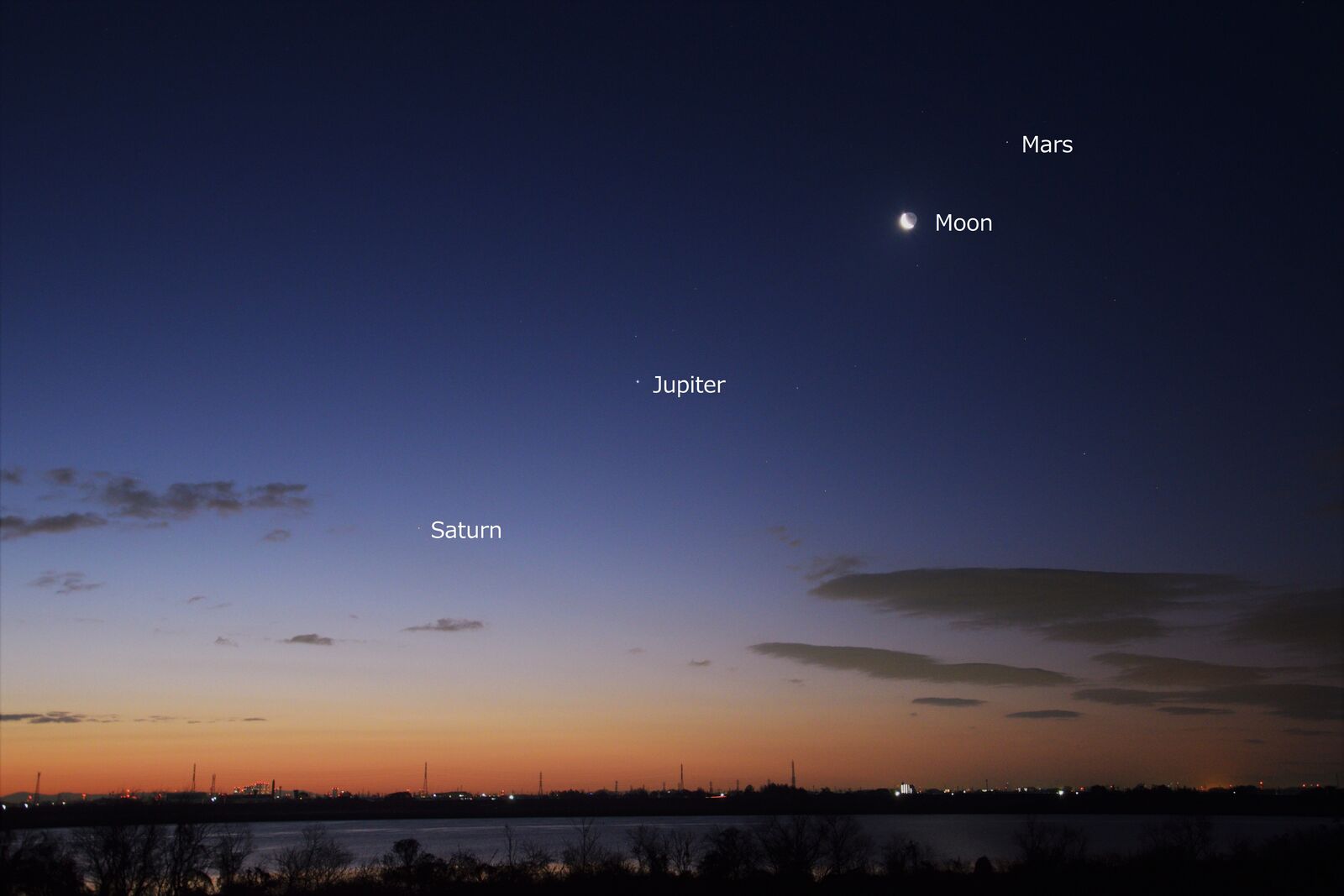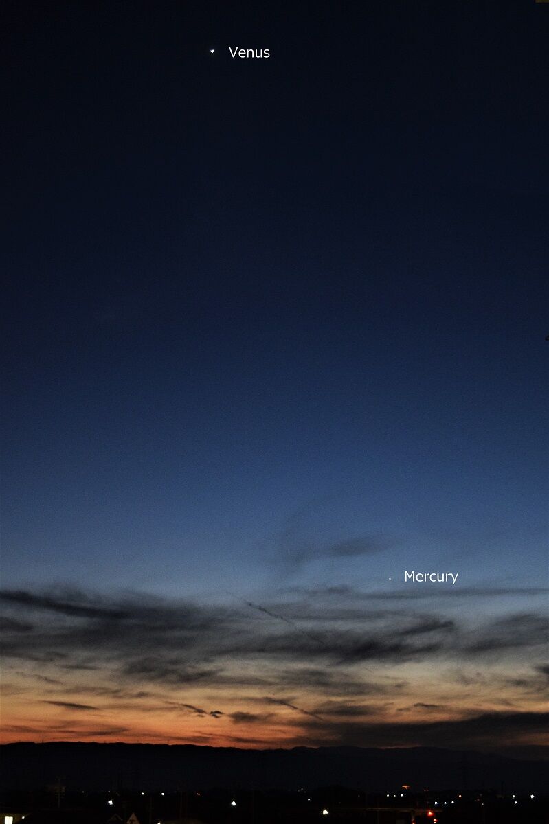 しかし,夕方の西の空低い位置にいるので,よほど空の開けた,しかも暗い場所があるところでないと,捉えることが困難です。また,明け方の北東でも見られるのですが,こちらもまた高度が低く,さらにむずかしいでしょう。