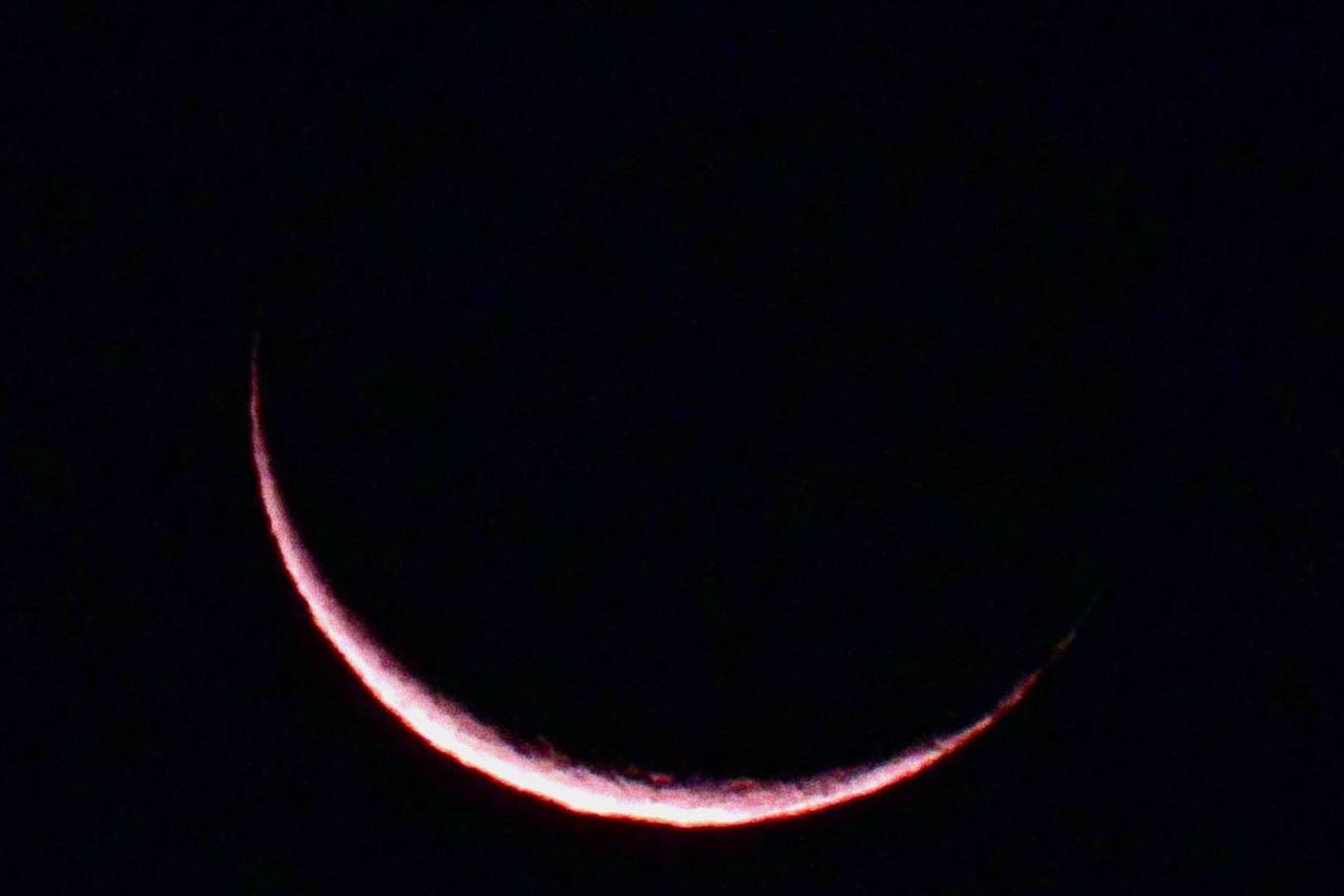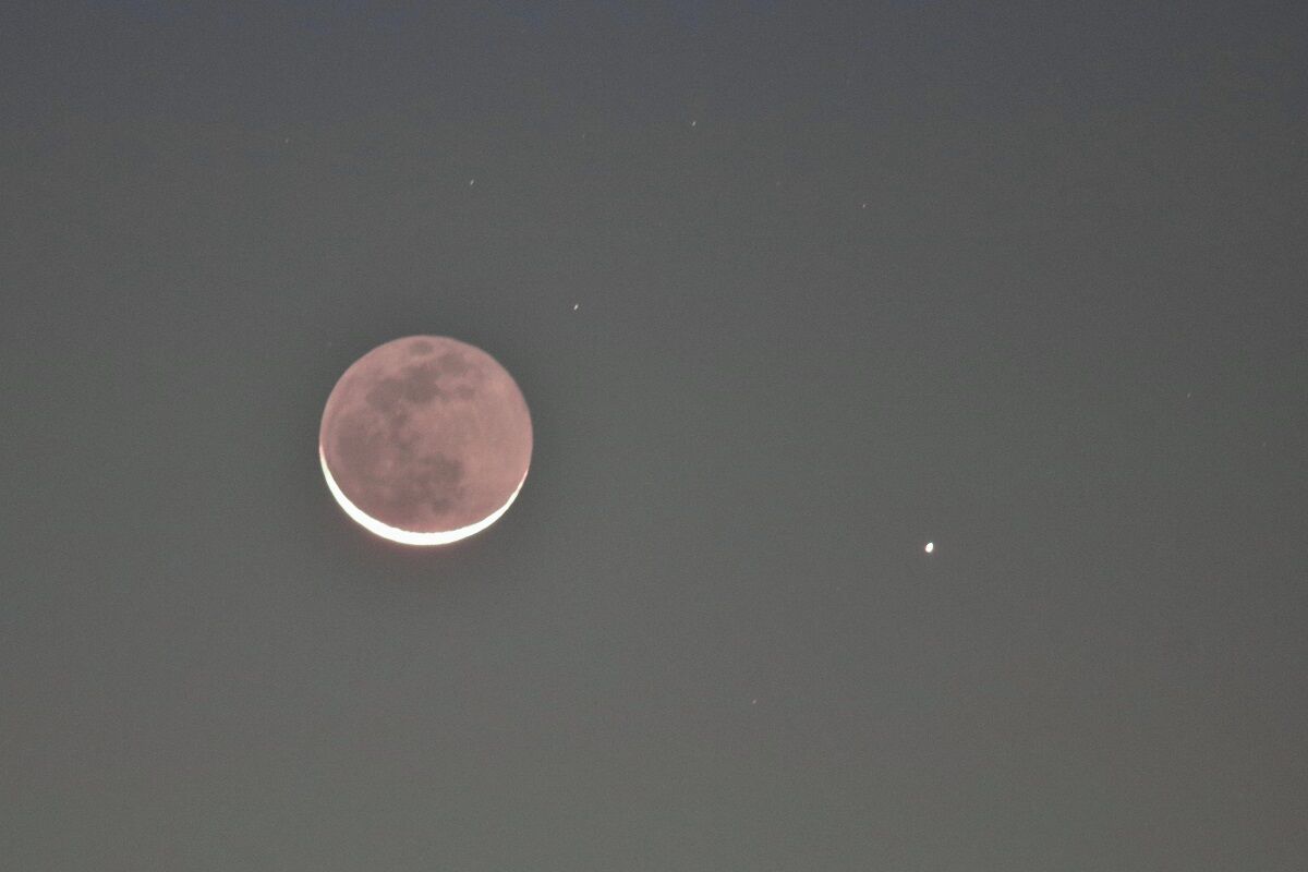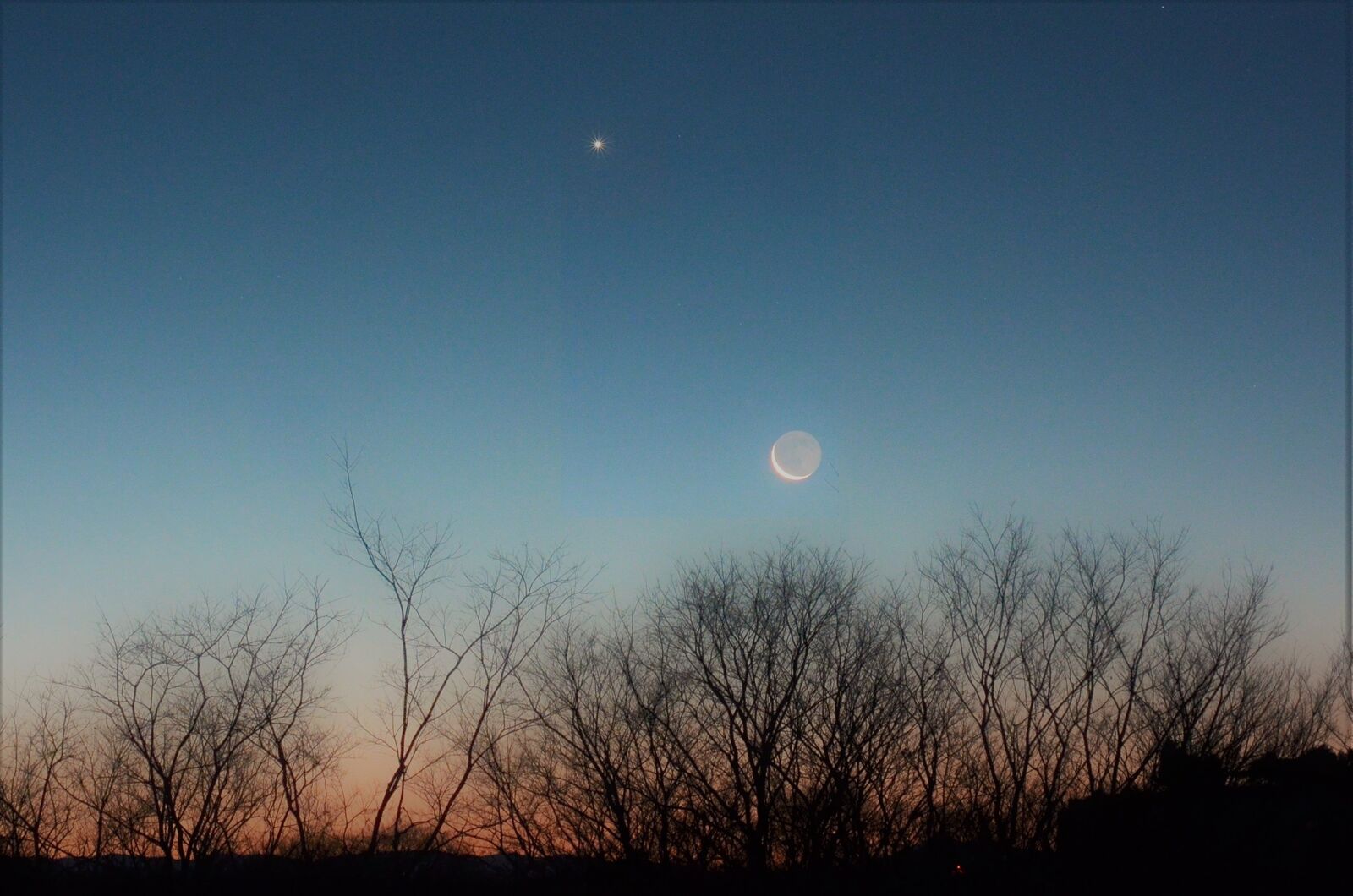 2月12日は月齢2.4。月の満ち欠けなど,珍しくもないのですが,この時期は空が澄んでいるので,とりわけ美しいのです。そこで,まだ,太陽が沈むまえに写したのが,2番目の写真です。その後,太陽が沈んだら,とりわけ美しい地球照が見えるようになったので,再び写したのが3番目の写真です。