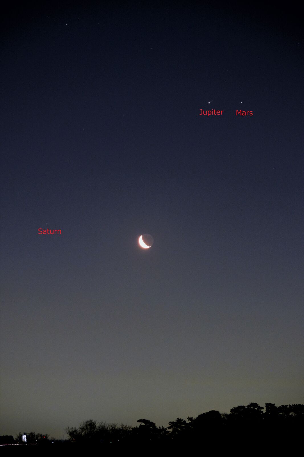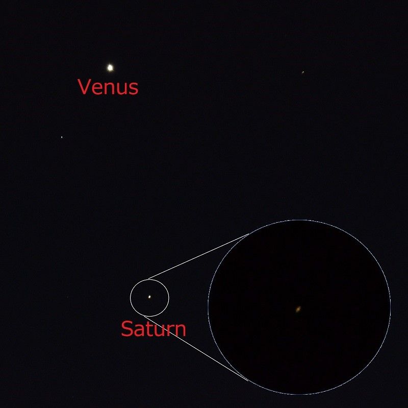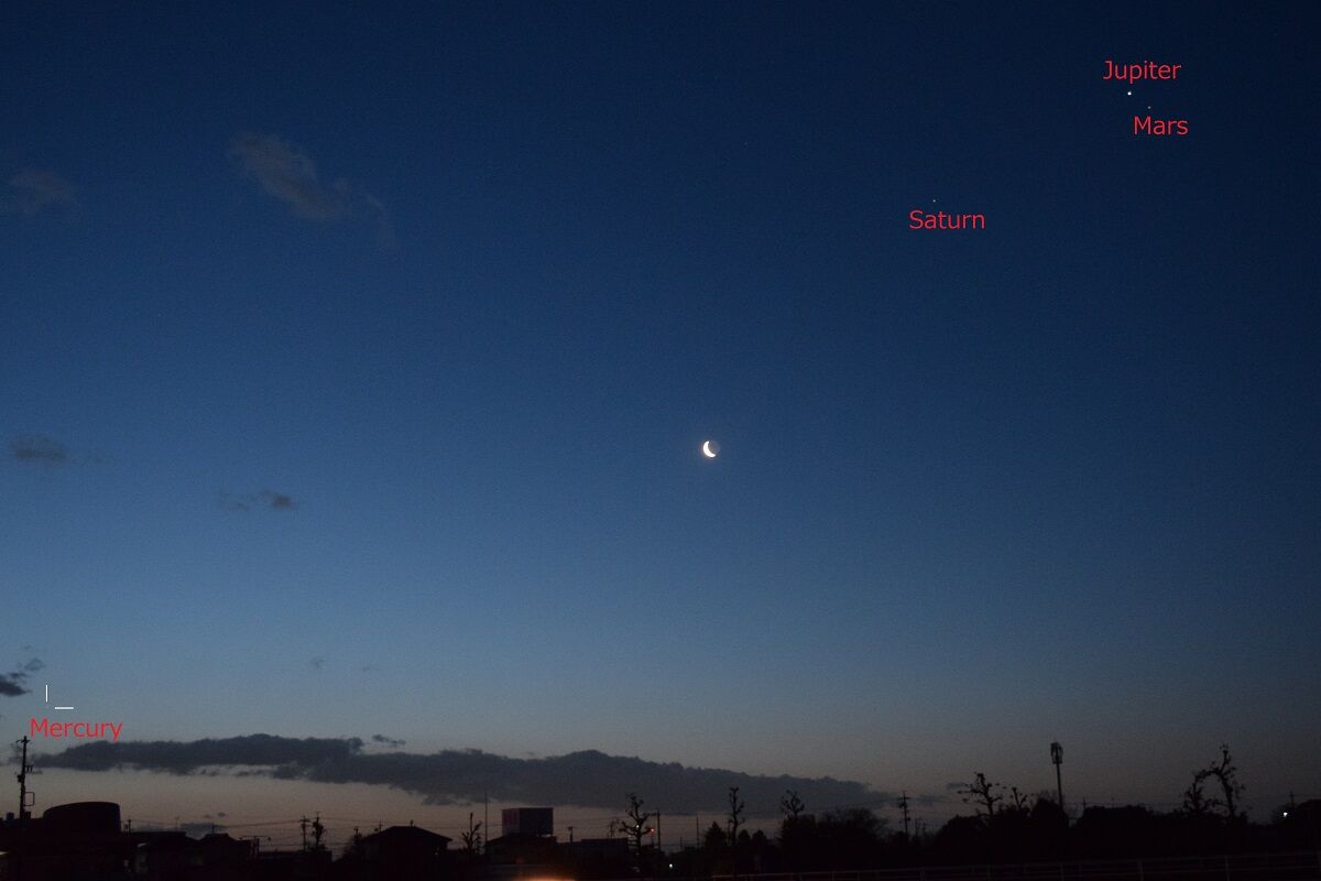 70ミリレンズを使うと金星と火星と水星を同じ画面に入れることができて,金星を右上に配置すれば,左下に火星と水星が入るので,画角に入れるのは容易で,写すためには感度と露出時間の塩梅だけでした。露出時間が少ないと星が写らず,反対に多すぎると,すでに薄明がはじまっているので,空に被ってしまい写りません。その匙加減がむずかしいのです。